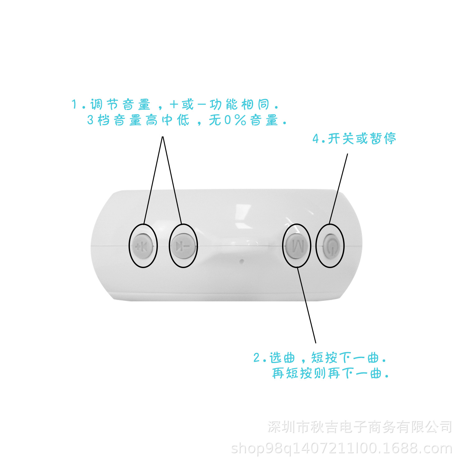 *音量选择按键:此两个按键功能相同,共有高/中/低3档音量选择,无0%音量,每按按键一次量将在高/中/低3个档位之间循环选择。