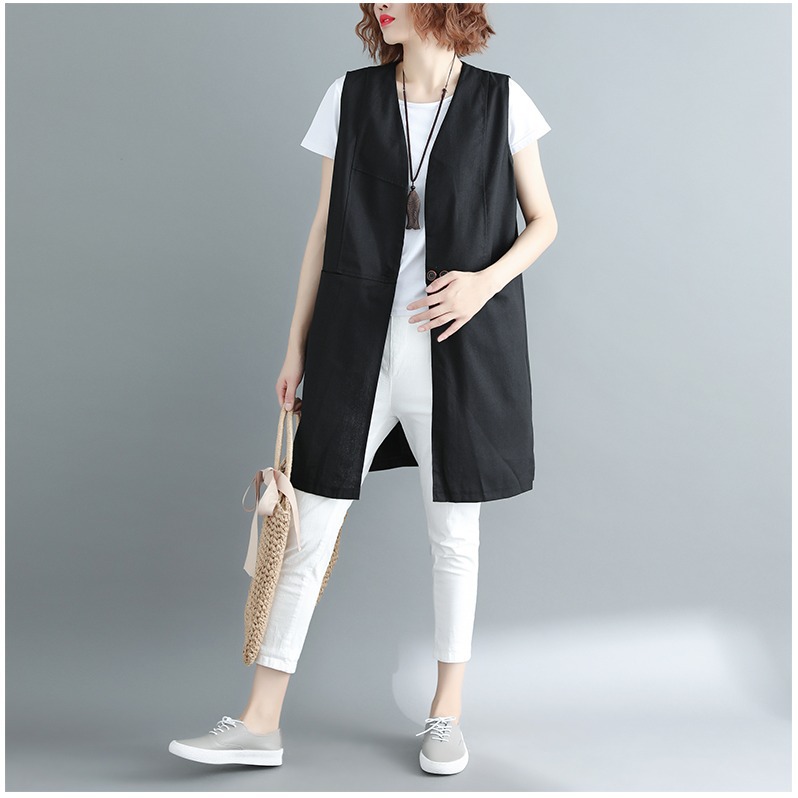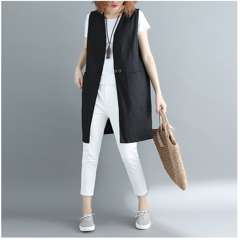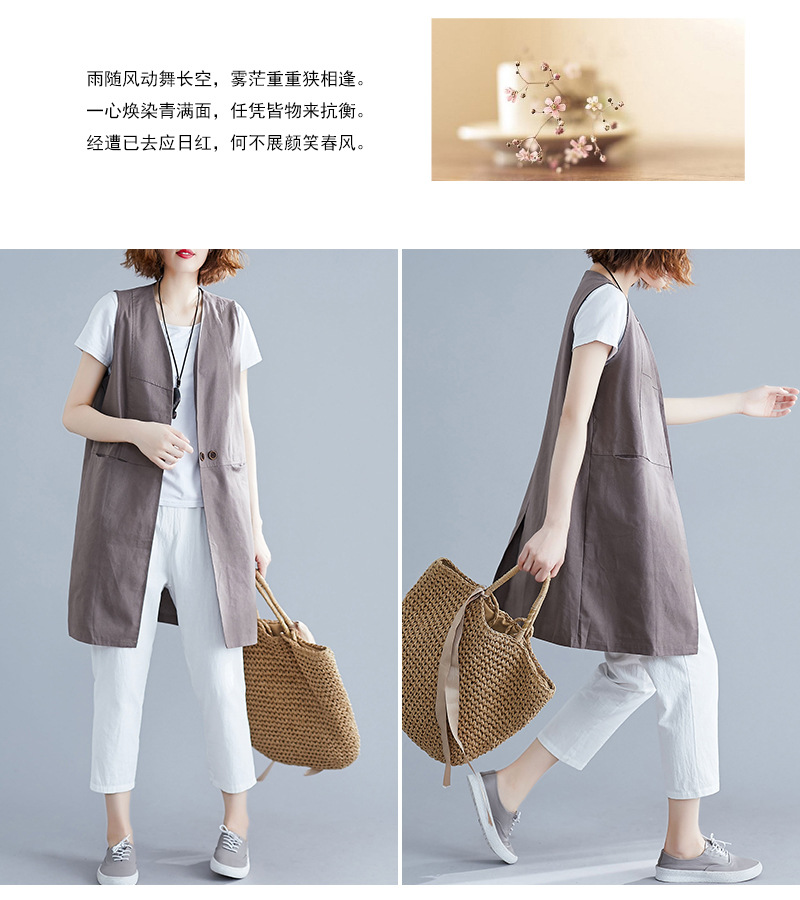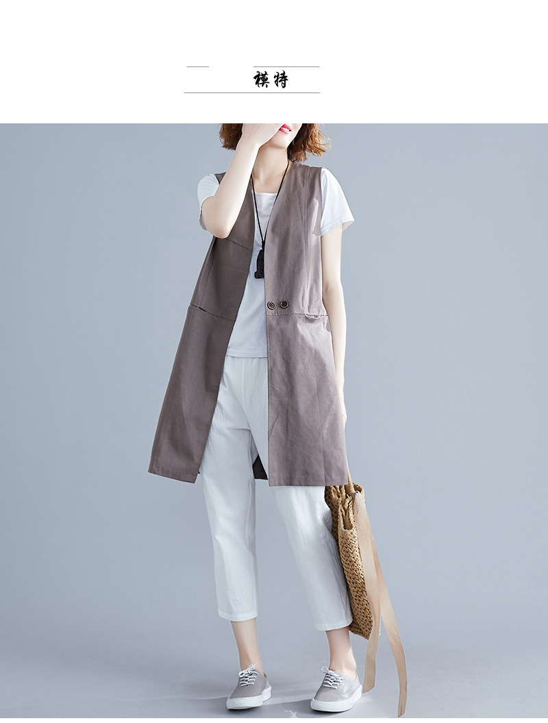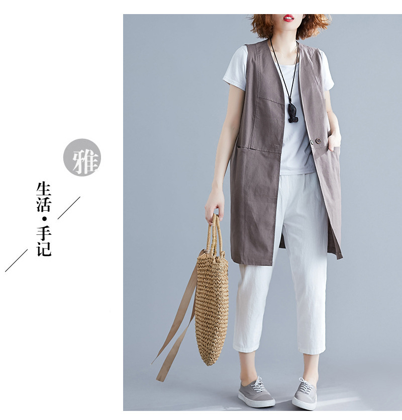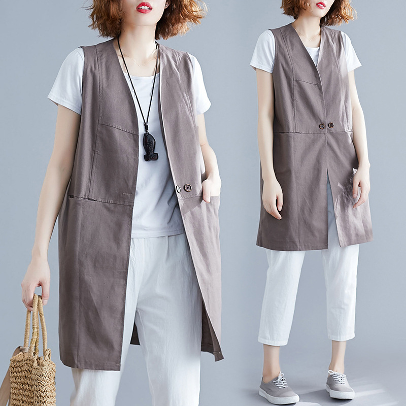 Женская одежда: Летний хлопково-льняной жилет свободного кроя без рукавов с V-образным вырезом, однотонный, средней длины, больших размеров, коллекция Весна/Лето 2025