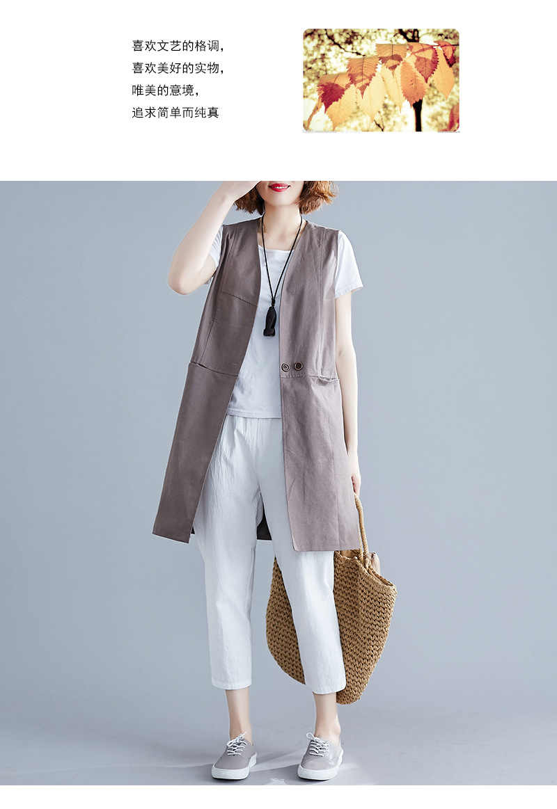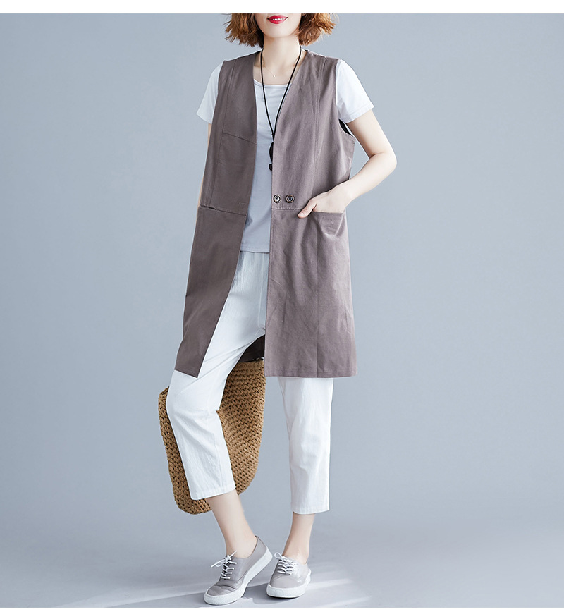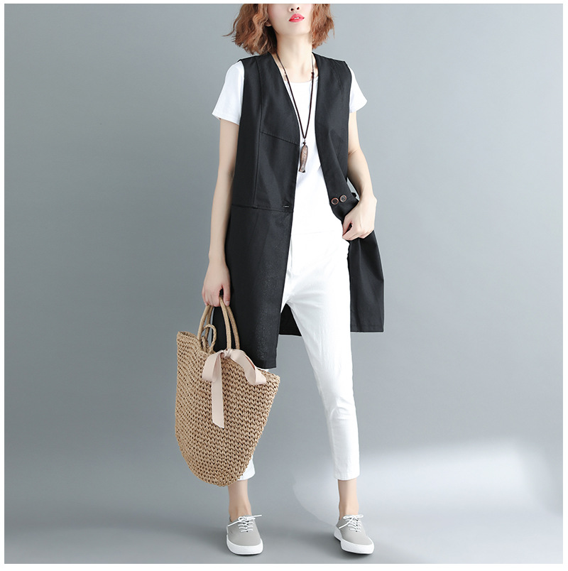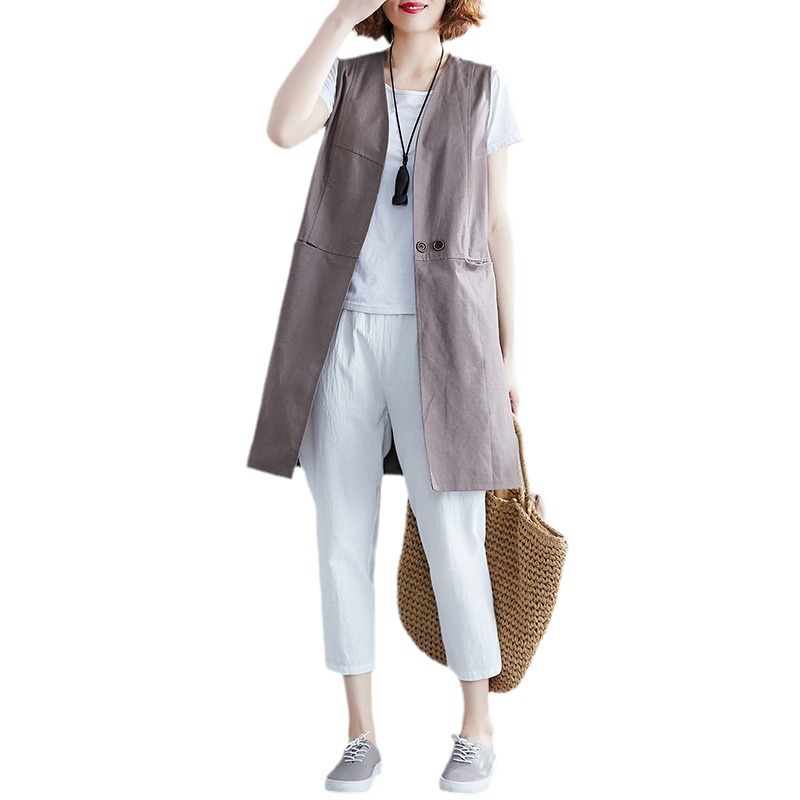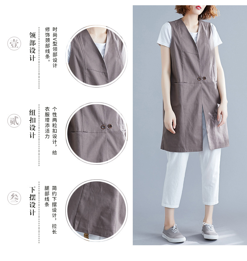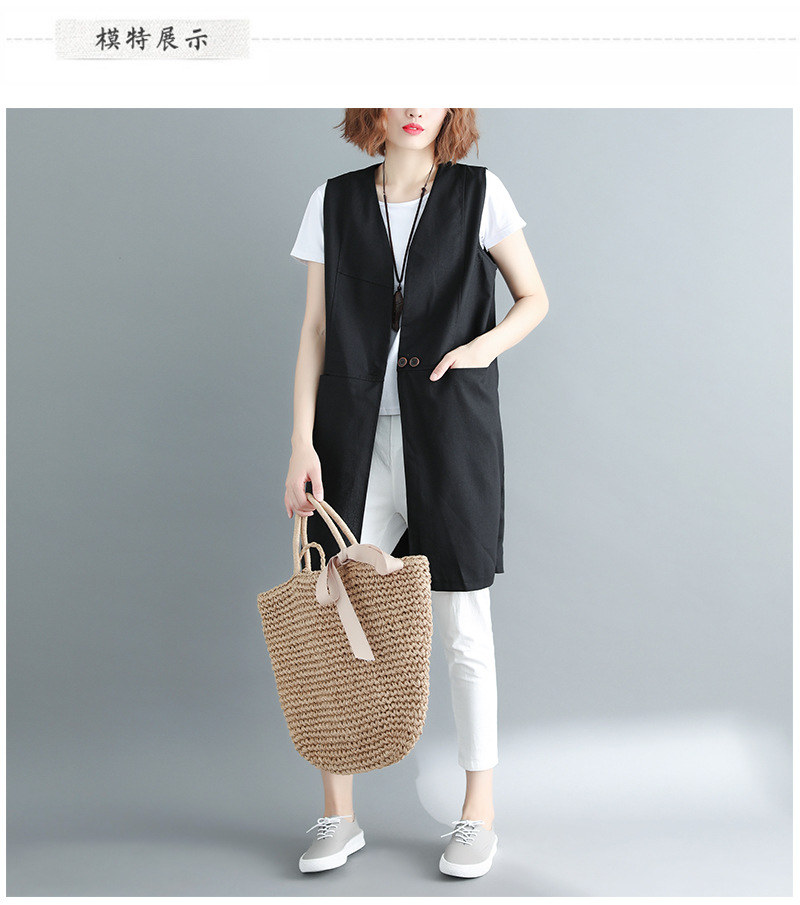 Женская одежда: Летний хлопково-льняной жилет свободного кроя без рукавов с V-образным вырезом, однотонный, средней длины, больших размеров, коллекция Весна/Лето 2025