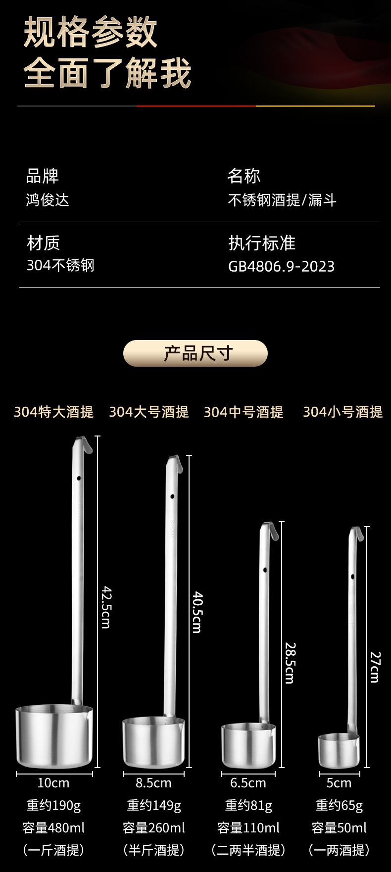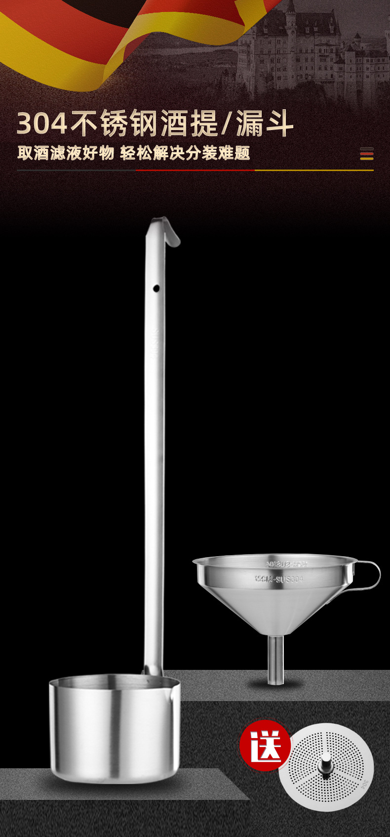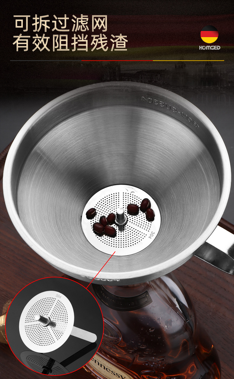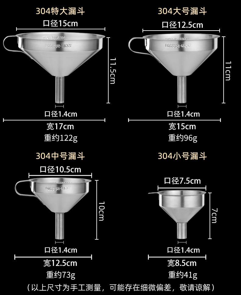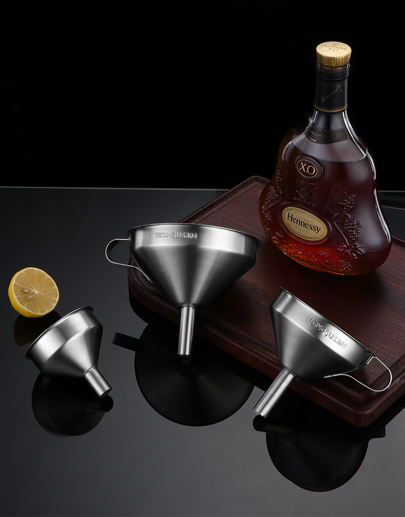 304 очень большой винный фликер (480ml); 304 большой винный фликер (250ml); 304 средний ликер (110ml); 304 разреза (50ml); 304 большая воронка (15cm); 304 большая воронка (13 см); 304 средняя воронка (10.5cm); 304 труба воронка (7.5cm)