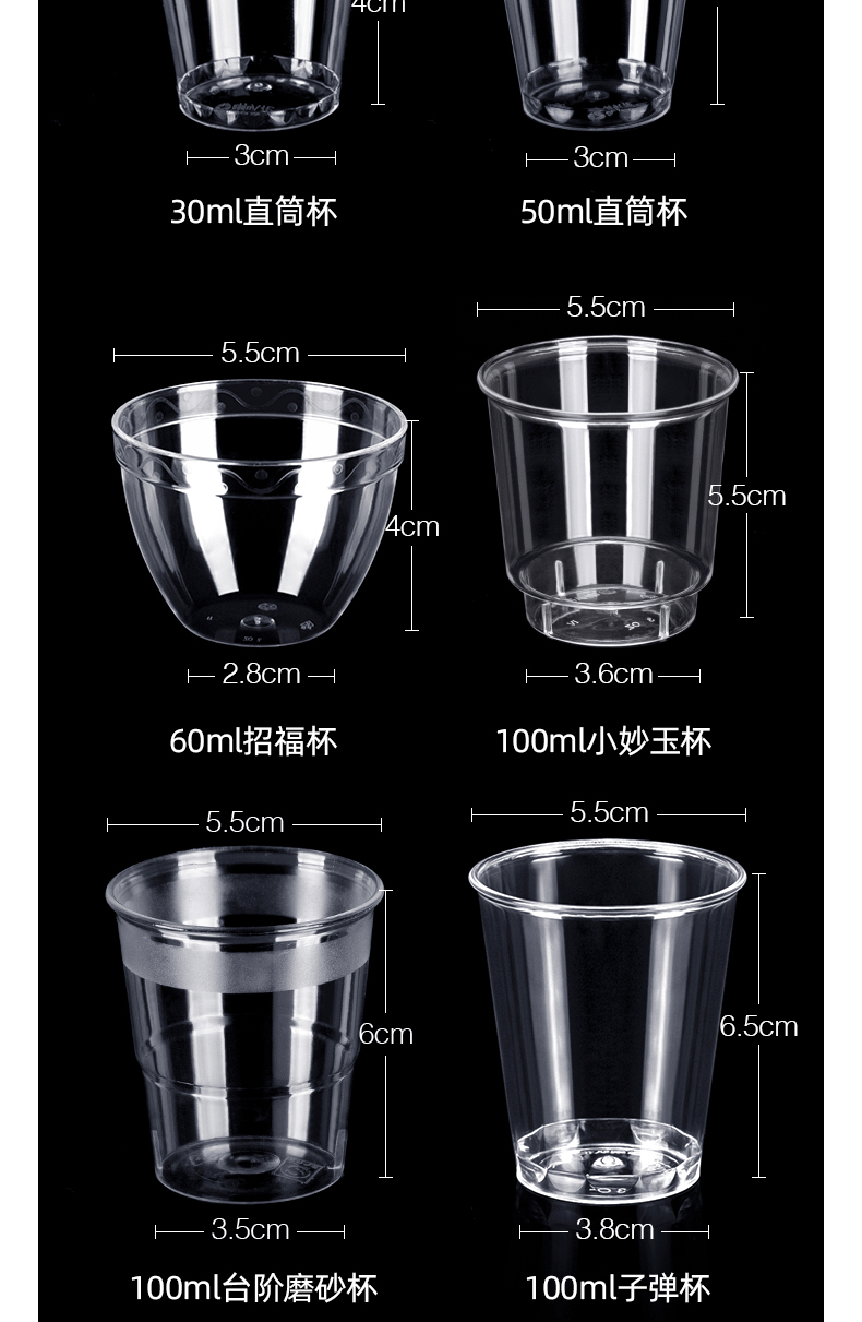 прозрачная чашка объемом 30 мл.; Красная чашка 30 мл.; Прямая чашка объемом 50 мл.; Чашка чая 60 мл.; 60 мл Счастливая чашка; Чашка-пуля на 100 мл.; Чашка Сяо Миаоюй на 100 мл.; Стакан с матовой поверхностью объемом 100 мл.; Чашка чая 110 мл.; Чашка чая «Фудзи» 110 мл.