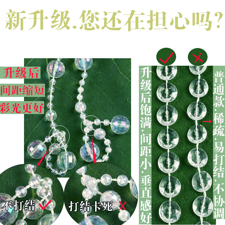 【工艺】仿水晶珠子,不脱色.耐磨.珠子是用A级亚克力材料经高温浇铸成形在一根特制的线上,所以珠子是固定的不能滑动,线也不易磨断。