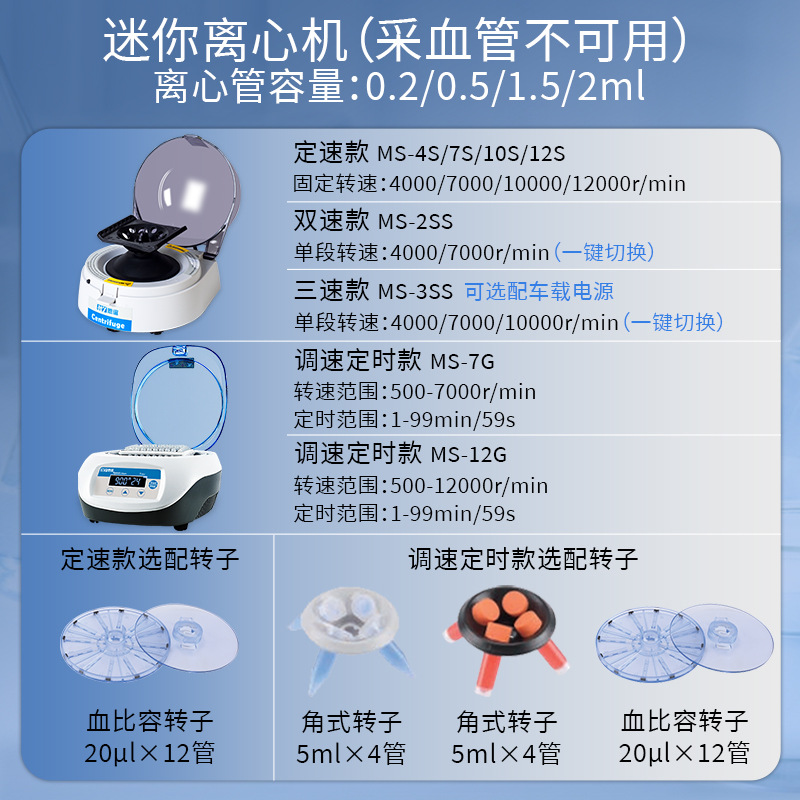 MS-4K(4000 об.); MS-7K(7000 об.); MS-4S с фиксированной скоростью 4000 об/; MS-7S с фиксированной скоростью 7000 об.; MS-10S с фиксированной скоростью 10000 об.; MS-12S с фиксированной скоростью 12000 об.; MS-2SS; MS-3SS; MS-12G скорость синхронизации 500-12000 об/; MS-7G скорость синхронизации 500-7000 оборотов; TD4C Низкая скорость небольшой емкости; TD4 Низкая скорость небольшой емкости; TD6 Низкая скорость небольшой емкости; TD5A Низкая скорость большой емкости; TG16G Высокая скорость; DD5 низкоскоростная морозильная центрифуга; TGL-16M высокоскоростная охлажденная центрифуга; MPC2800