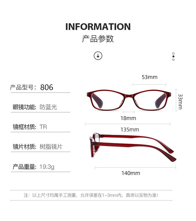 805 мужской черный; 806 женский красный; 832 яркая черная рамка; 832 прозрачная фиолетовая рамка; 832 прозрачная красная рамка; 7008 яркая черная рамка; 7008 темпераментный красный; 7008 Фантастика Фиолетовый; 13017 яркая черная рамка; футляр для очков; ткань для очков
