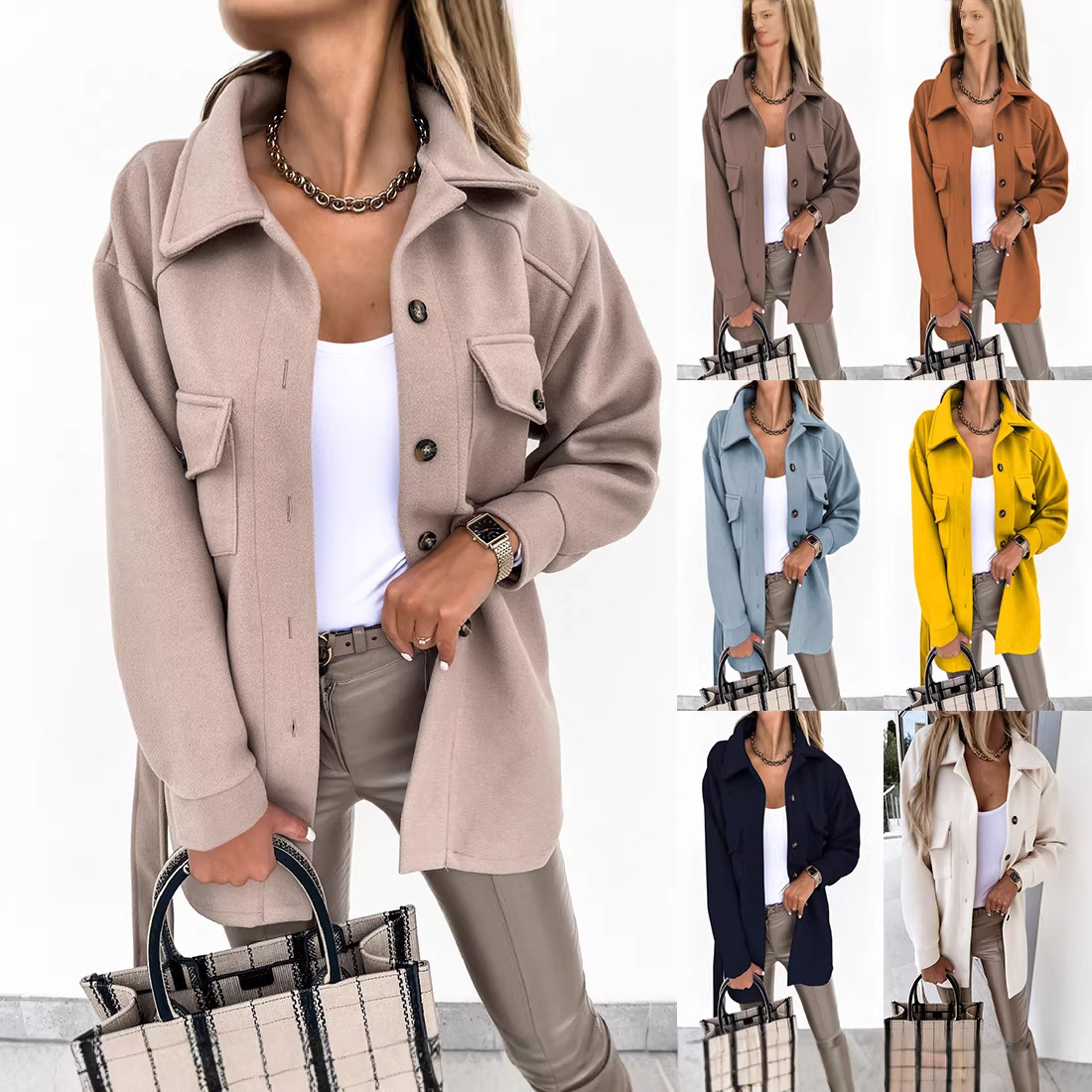 欧美跨境2021秋冬翻领单排扣加厚纯色衬衫毛呢宽松外套女厂家直供