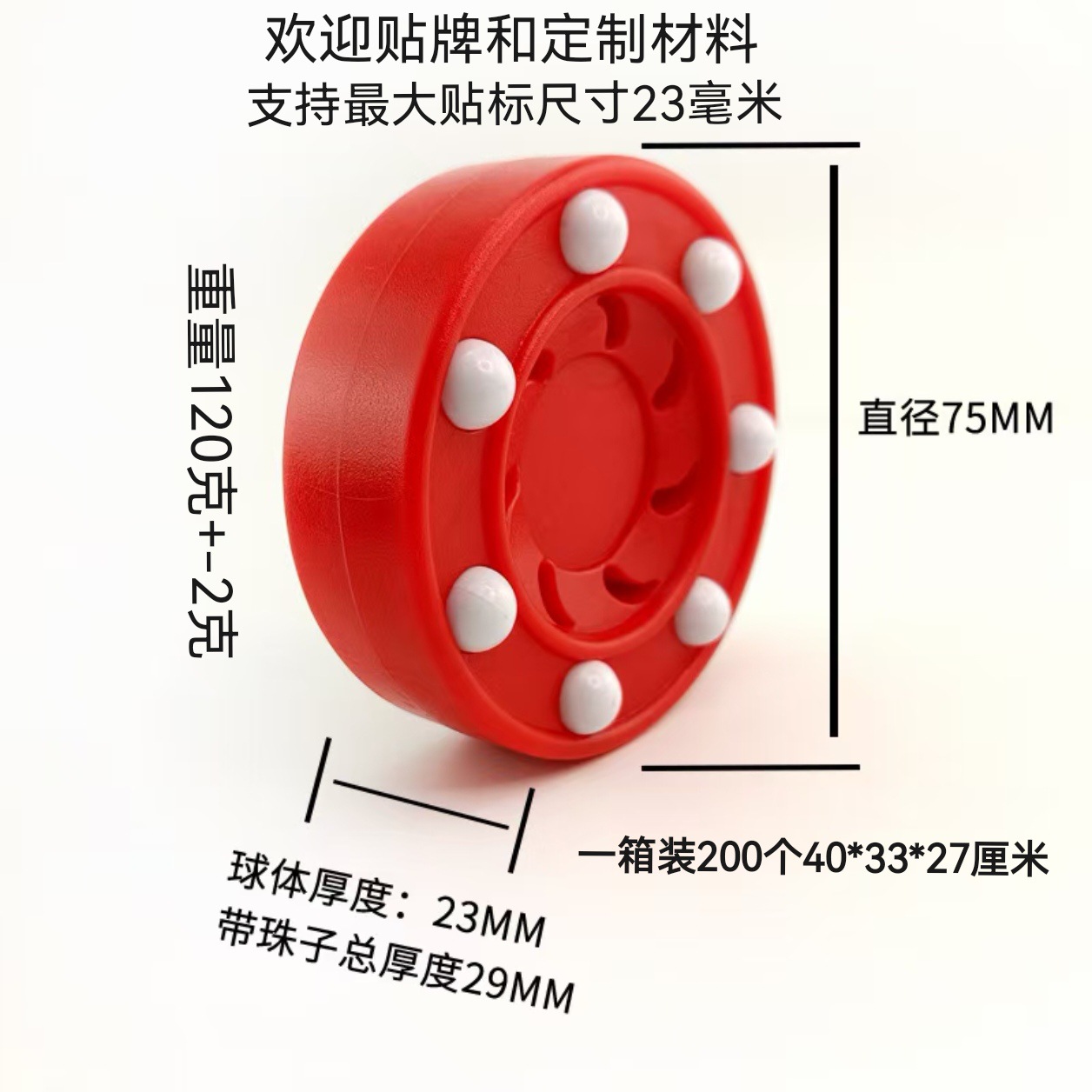该轮滑球直径70毫米高度35毫米,离地间隙6毫米,重量104克,可以按你需要装配不同珠子的颜色