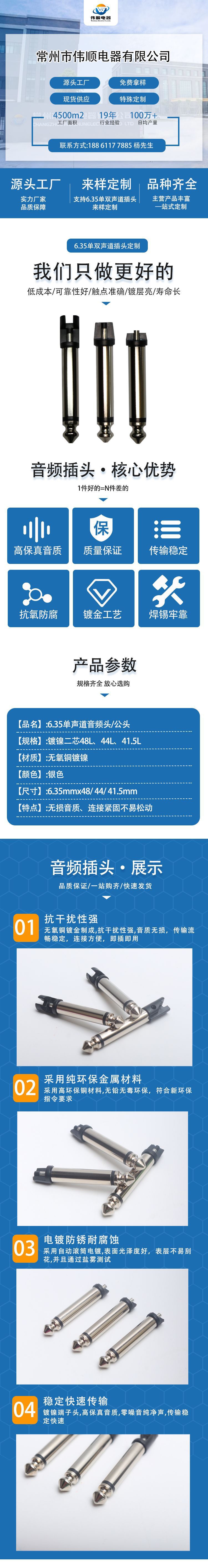 Аудиоразъем 6,35 мм, двухжильный, никелированный, моно, экологически чистый, термостойкий, для микрофонов и прямых трансляций