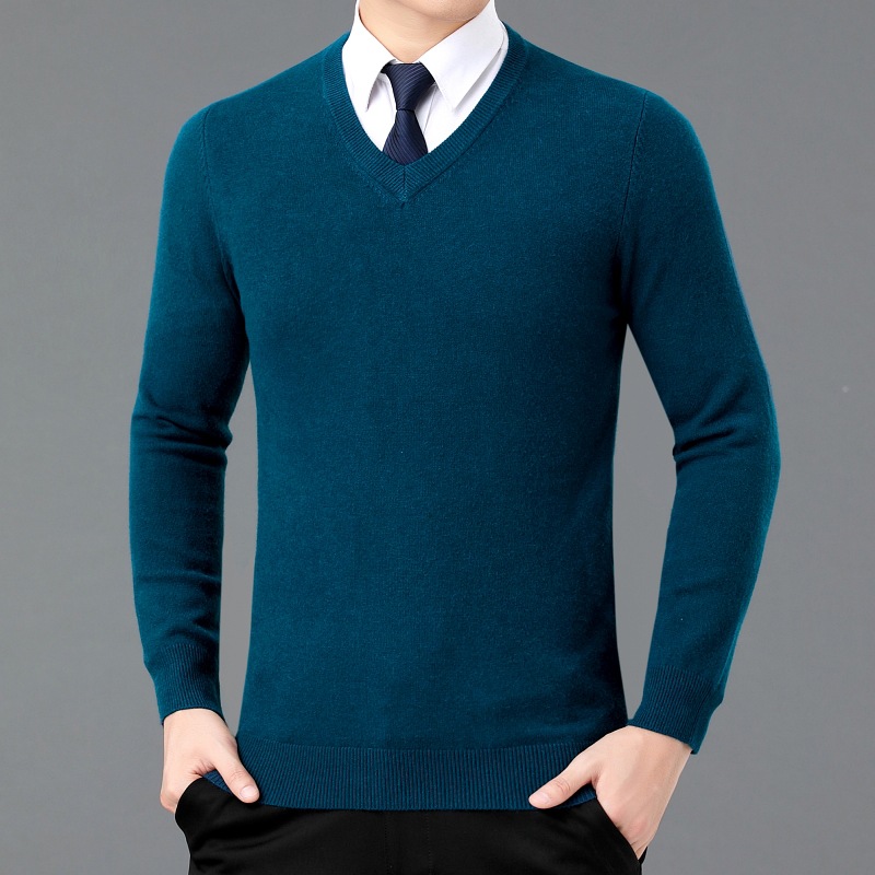 2024 зимние мужские шерстяные свитера среднего возраста мужской бизнес-джокер классический пуловер V-образный вырез сплошной цвет нижний свитер