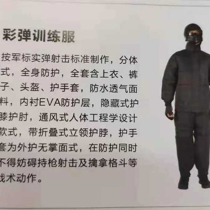 彩弹服按军标训练实弹射击标准制作,分体式,全身防护,全套含上衣、裤子、头盔、护手套共4件套,防水透气面料,高压EVA防护层,隐藏式护膝护肘 标记弹防护服