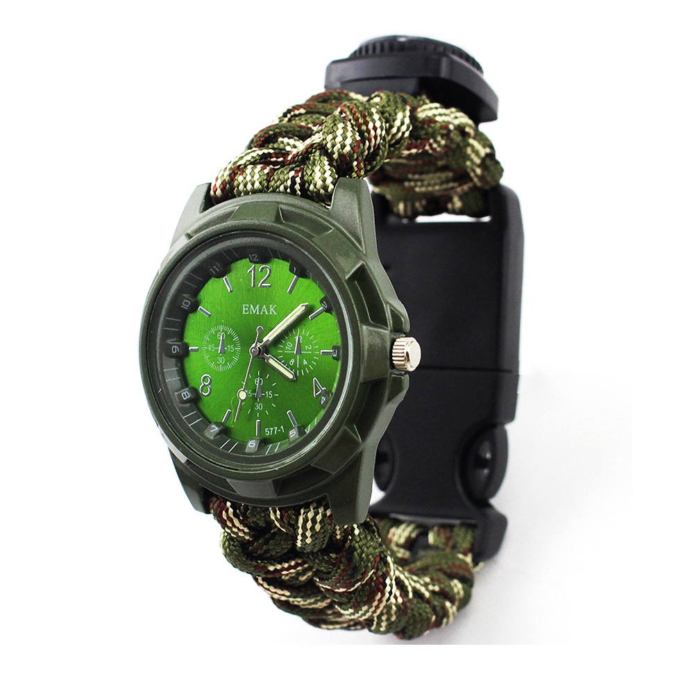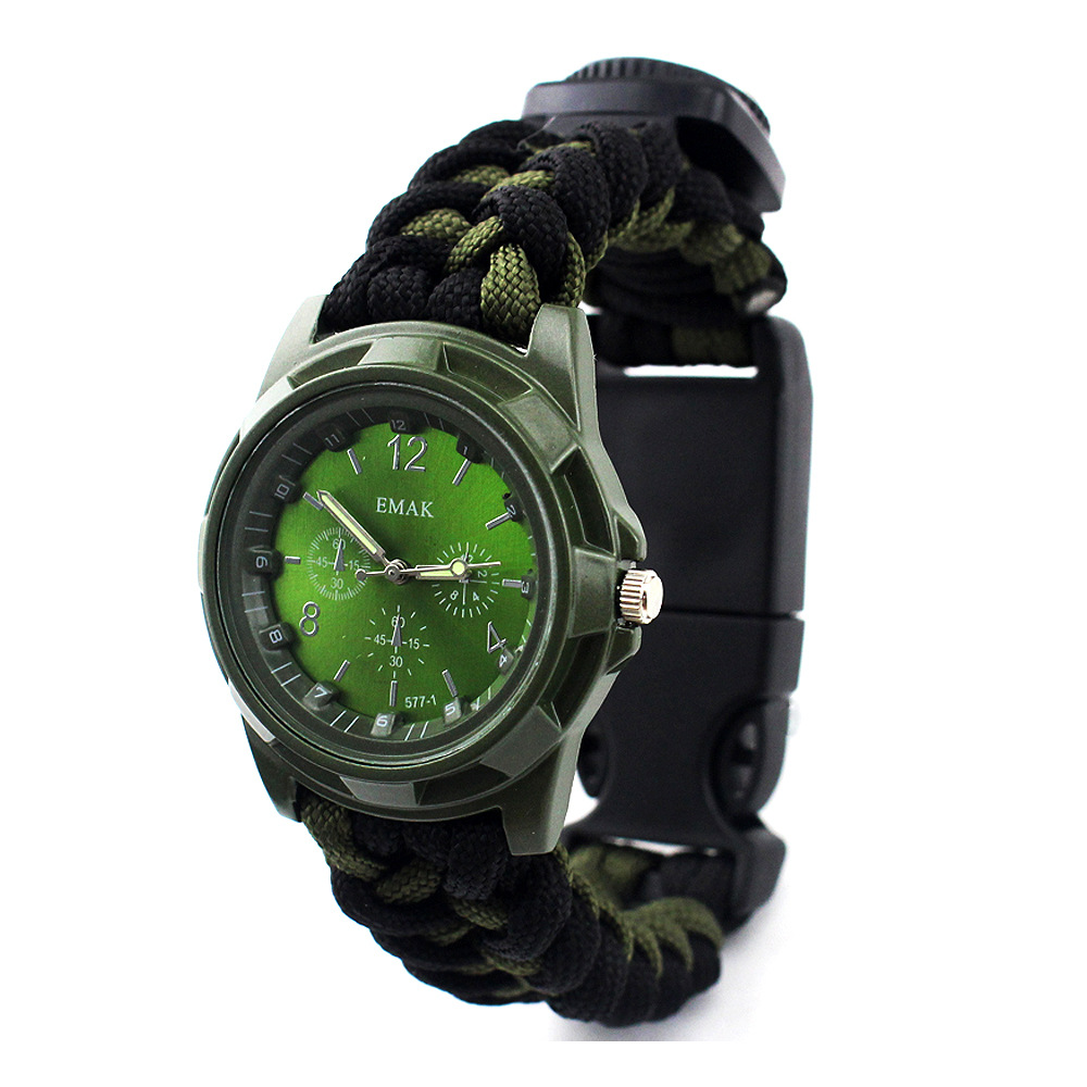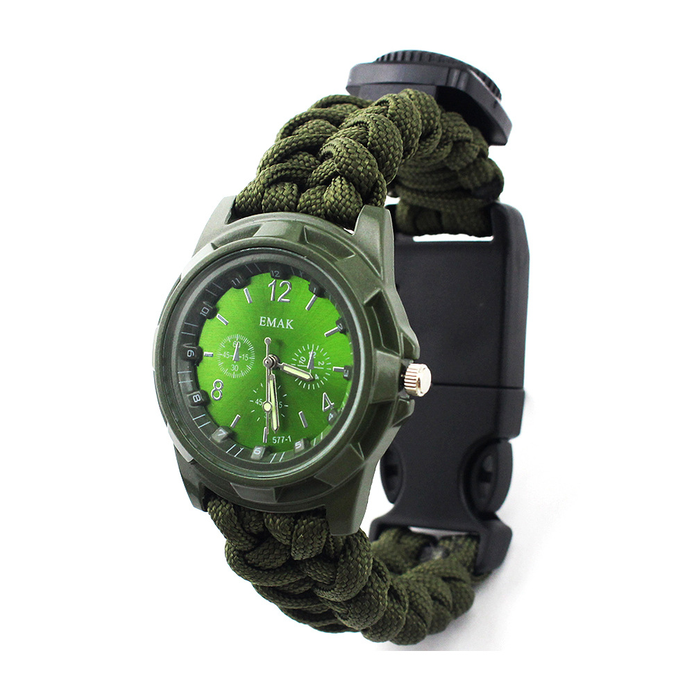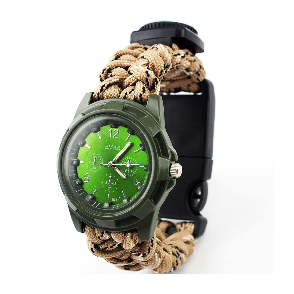 这不是一款普通的伞绳手表,它具有更多户外求生功能。它配备了户外救生取火石,切绳刀,求生口哨,和一根长约3.5米左右的7芯伞绳,为您的户外探索提供保障。