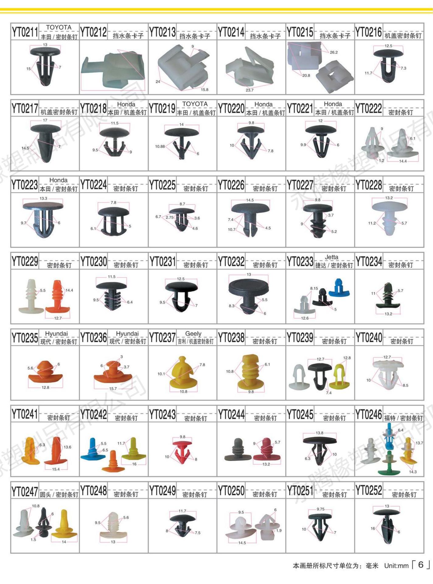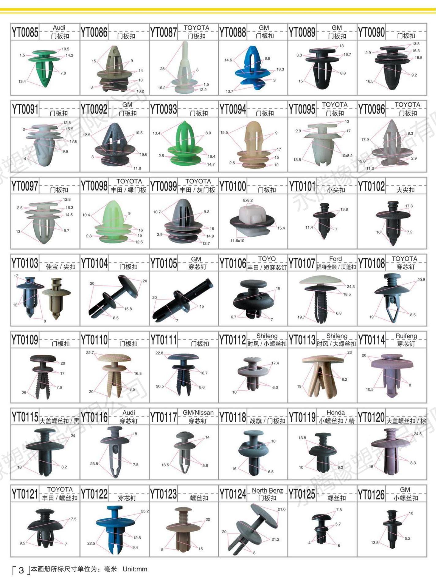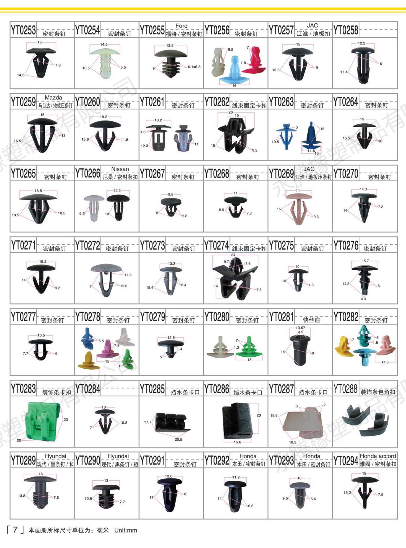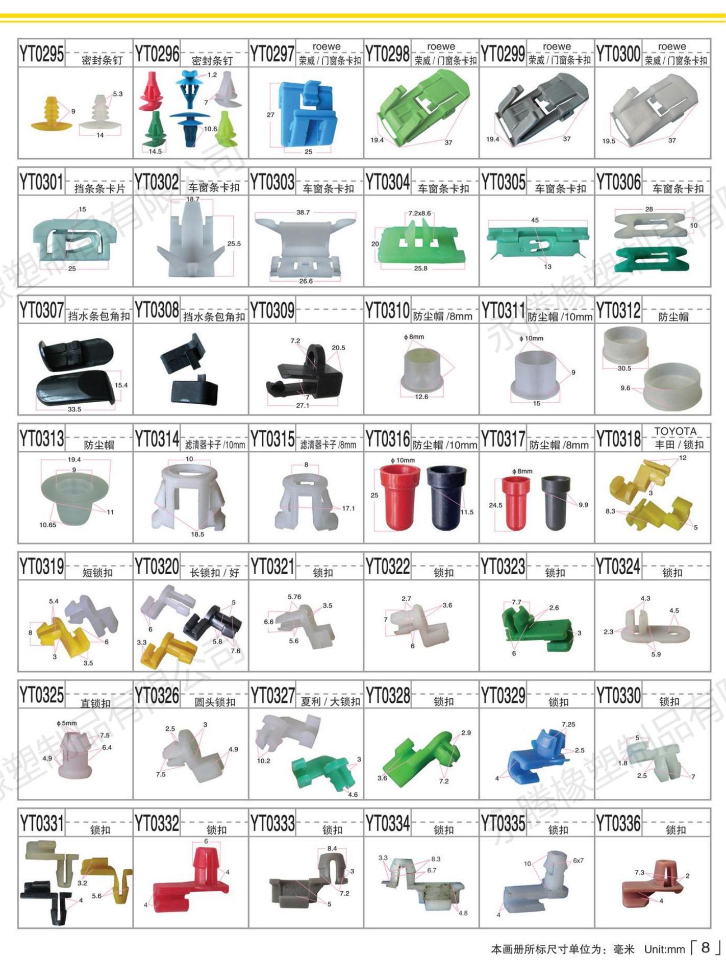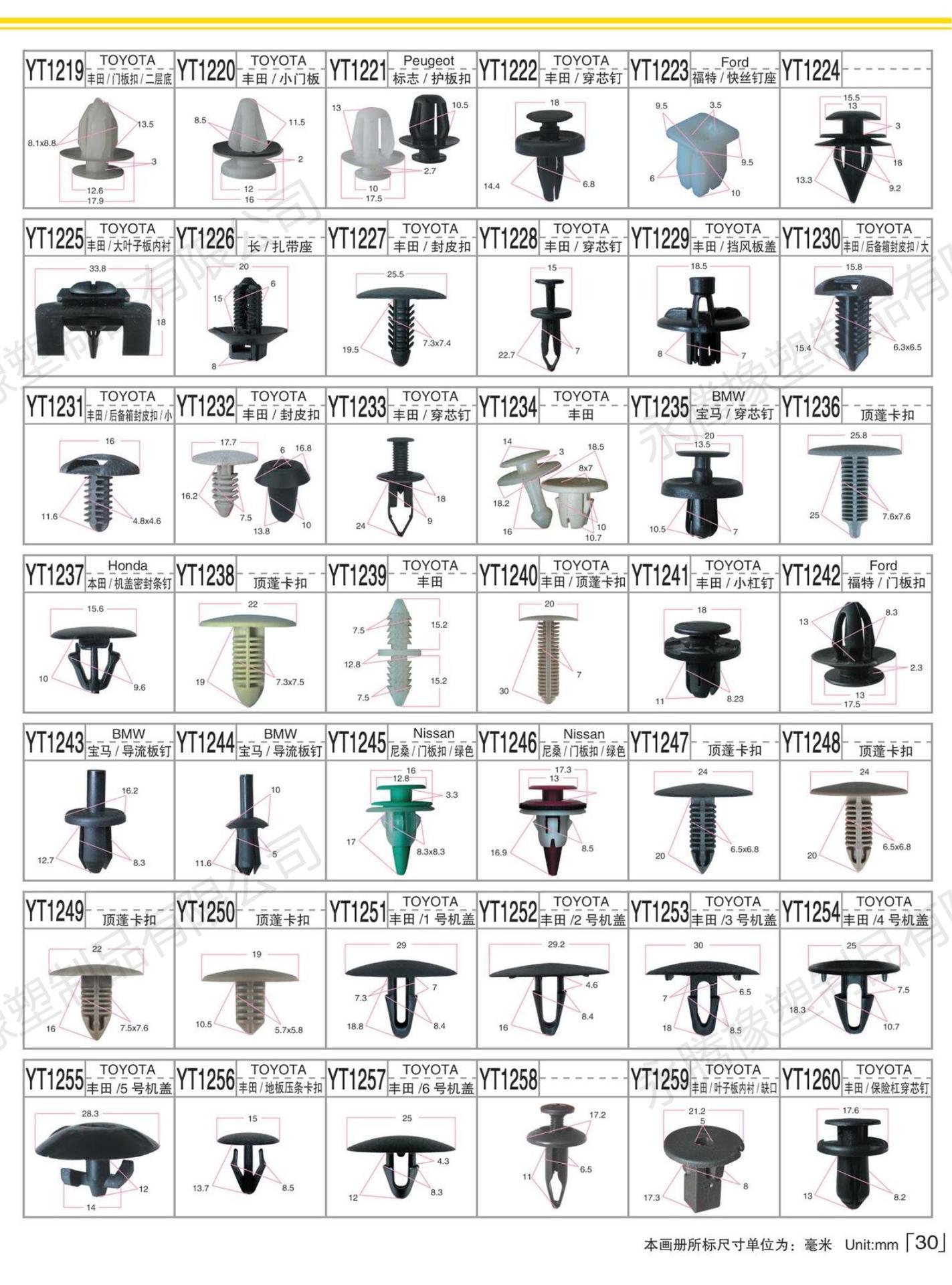 南宫市永腾橡塑制品有限公司主营汽车塑料卡扣、汽车卡扣、塑料卡扣、汽车铆钉、倒刺卡扣、门板卡扣、密封条钉、膨胀螺丝扣、汽车顶棚卡扣、仪表盘固定卡扣、穿心钉卡扣、不锈钢喉箍、尼龙扎带、线束卡子、管束卡子、汽车锁扣、自攻丝座、汽车玻璃托、玻璃开窗器、汽车摇柄、机盖隔热棉卡扣、支撑杆卡扣、叶子板卡扣汽车门内饰固定卡扣、装饰板固定卡扣、家具安装卡扣、线束固定卡扣、树形倒刺卡扣、定位夹卡扣、尼龙扎带、推进式膨胀卡扣等多种塑料卡扣等。