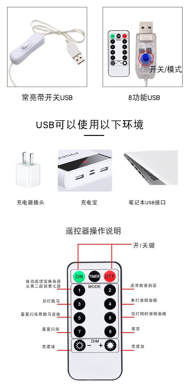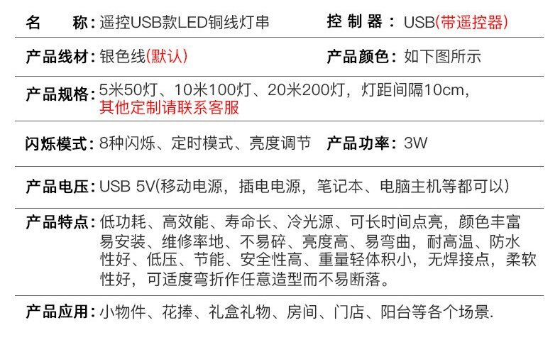 USB 1.1m фонарей; USB 2.2m фонарей; USB 3.3m фонарей; USB 5.5m фонарей; USB 10.1m фонарей; USB 20.2m фонарей; 8 функций, 2.2m индикатора (модель с дистанционным управлением через USB); 8 функций, 3.3m индикатора (модель с дистанционным управлением через USB); 8 функций, 5.5m индикатора (модель с дистанционным управлением через USB); 8 функций, 10.1m индикатора (модель с дистанционным управлением через USB); 8 функций, 20.2m индикатора (модель с дистанционным управлением через USB)