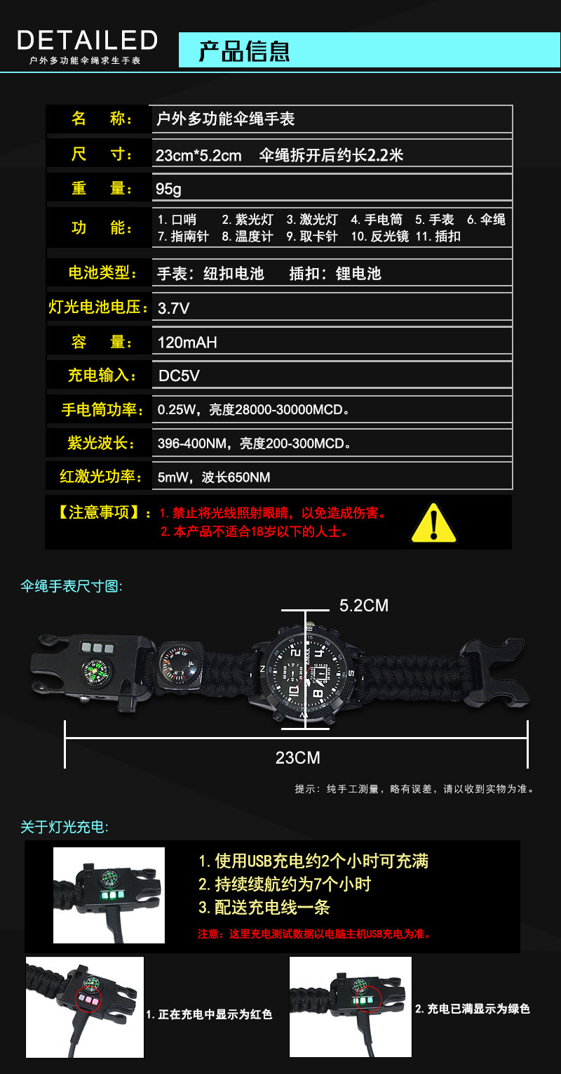 功能:1 手电筒,2 红外激光灯,3 紫光灯,4 求生哨,5 取卡针,6 放大镜,7 指南针温度计,9伞绳,10时间。