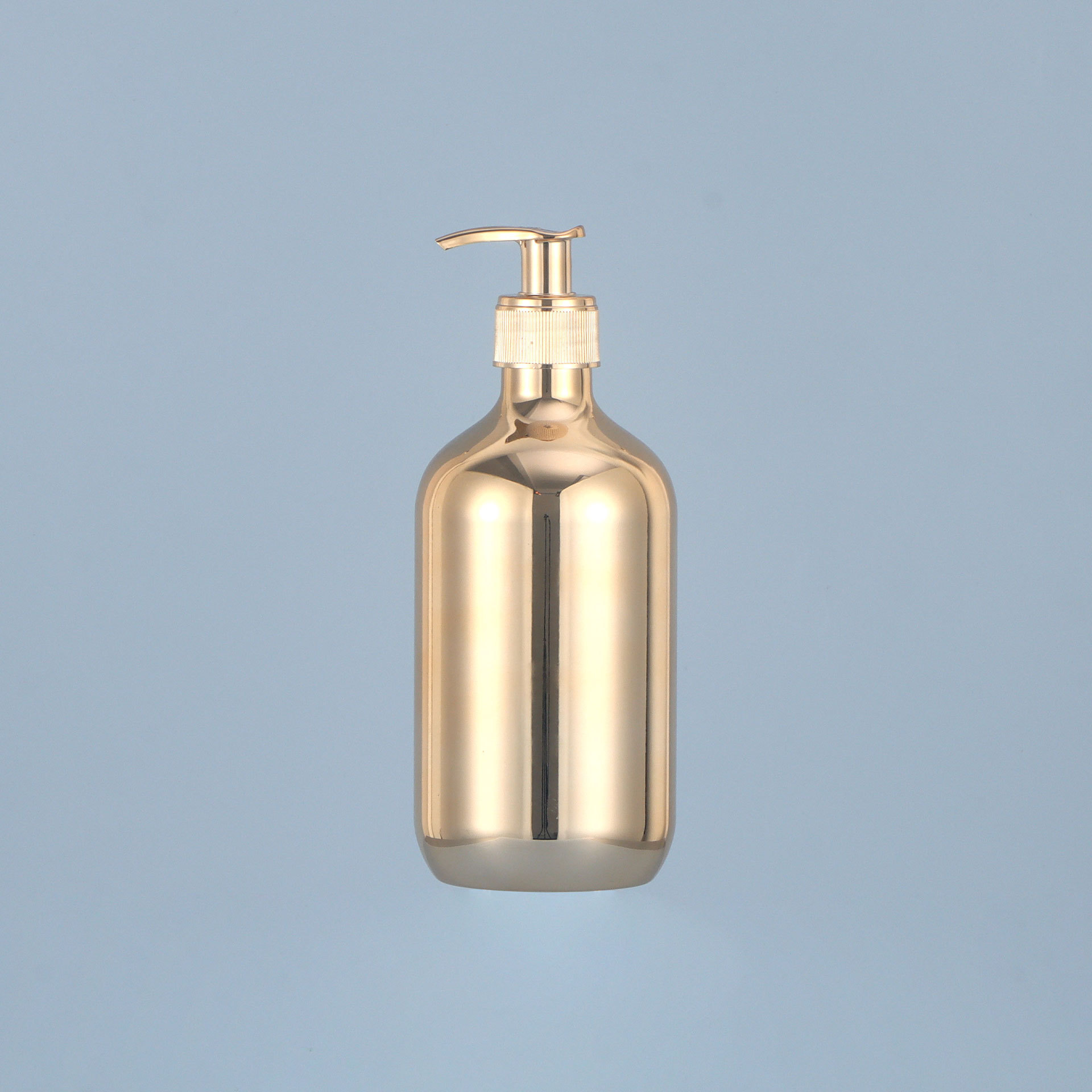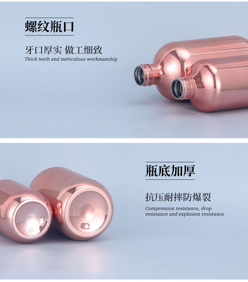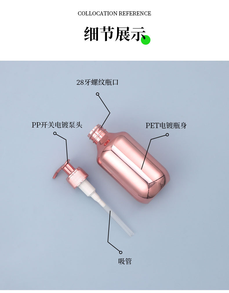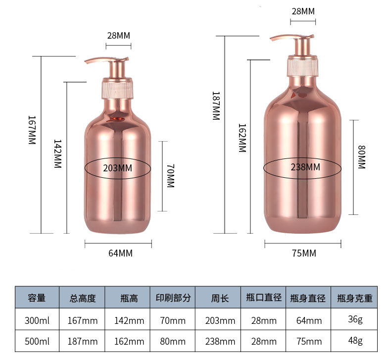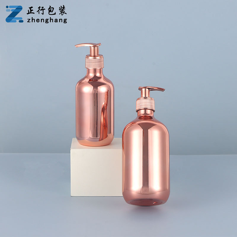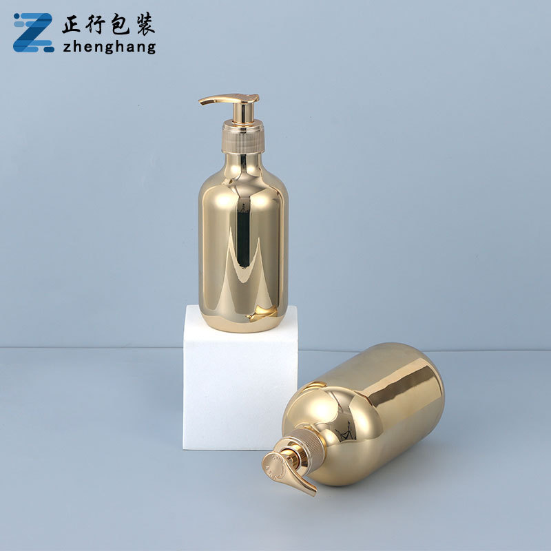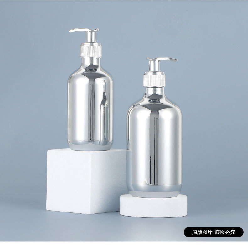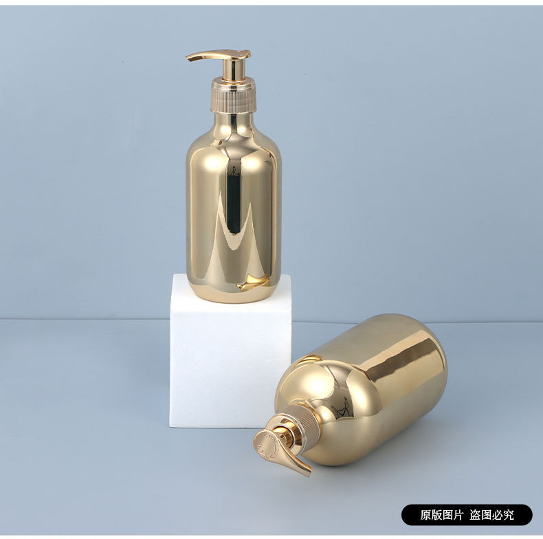 现货厂家28牙pet300ml电镀瓶 pp泵头洗发水金色银色电镀塑料瓶子