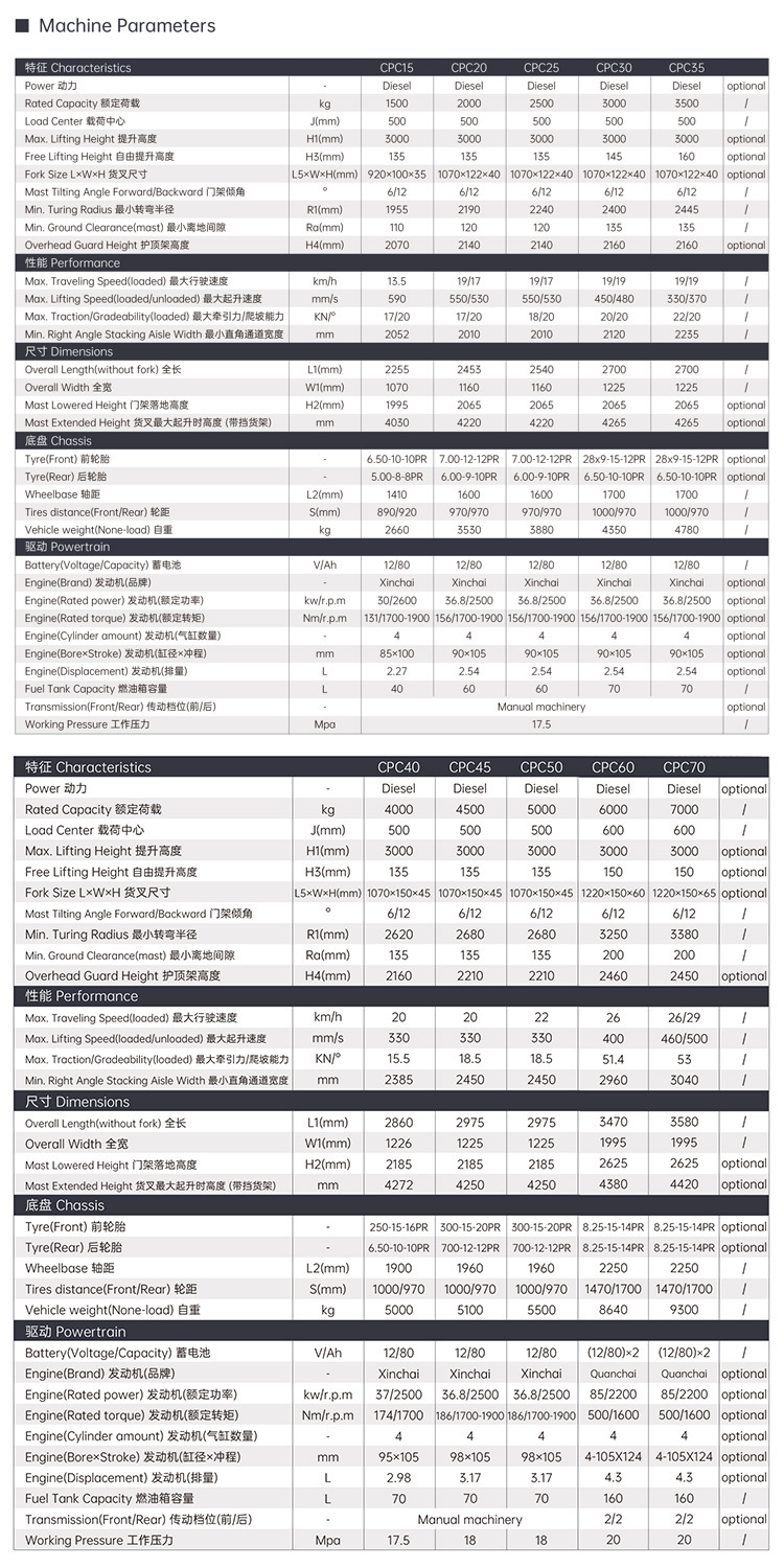Дизельный вилочный погрузчик (2 тонны впускного золота); Дизельный вилочный погрузчик (3 тонны золотого ввода); Дизельный вилочный погрузчик (3,5 тонн забора золота); Дизельный вилочный погрузчик (предлагается 4 тонны золота); Дизельный вилочный погрузчик (4,5 тонн забора золота); Дизельный вилочный погрузчик (5 тонн золотого направления); Дизельный вилочный погрузчик (7 тонн золотого направления); Дизельный вилочный погрузчик (предназначено 10 тонн золота)