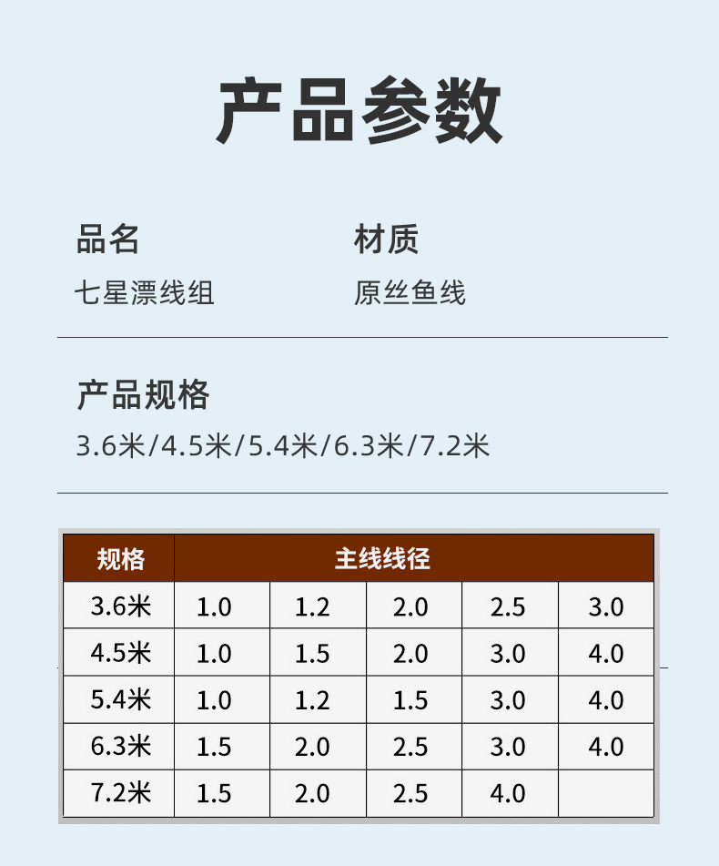 [3,6 м] Группа семи звезд с одинарным крюком; [4,5 метра] Одиночный крючок Seven Star; [5,4 м] Группа семизвездочных дрейфующих линий с одинарным крючком; [6,3 м] Группа семизвездочных дрейфовых линий с одним крючком; [7,2 м] Одиночный крючок для группы семизвездочных дрейфовых линий.