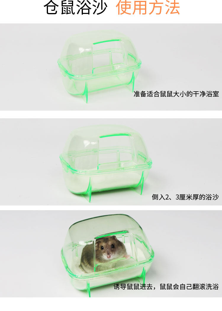 【使用方法】:先把仓鼠浴室冲洗干净,然后把约100g的香味浴砂放进去;每天沐浴1-2次(按天气是否潮湿而定),每次沐浴15-20分钟便可,浴砂用上3-4次就要彻底更换。
