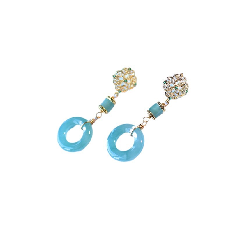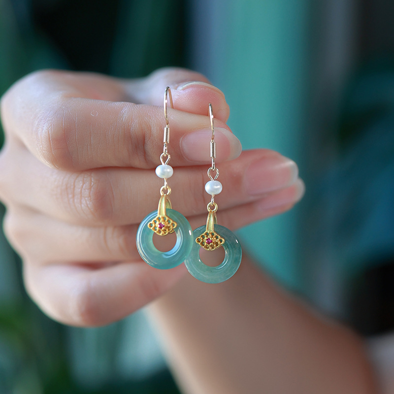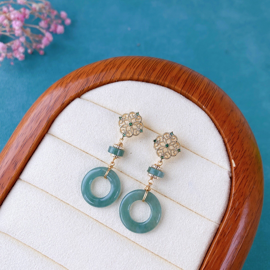 Серьги с горизонтальной пряжкой из нефритового ледяного синего цвета, модель с инкрустацией из 14-каратного золота