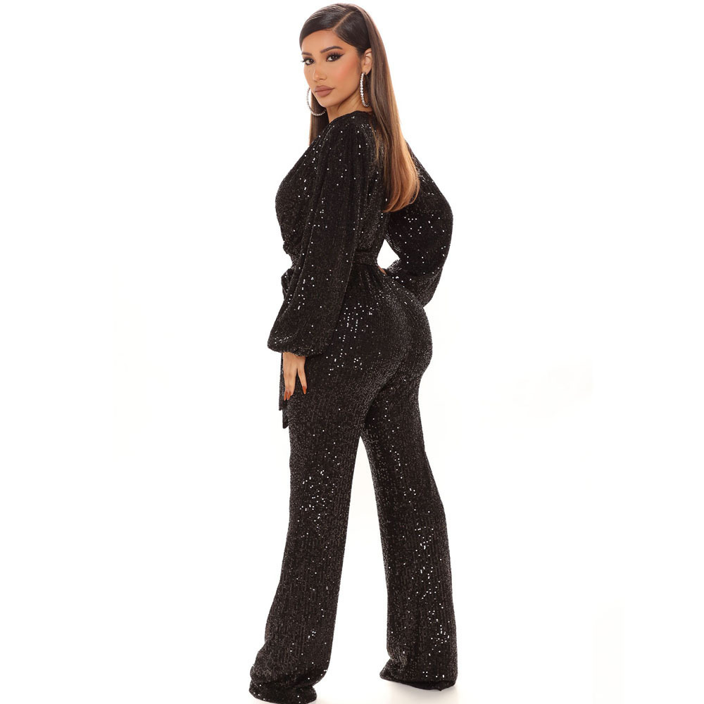 Amazon Explosions Осенние европейские и американские высококачественные женские брюки с пайетками и глубоким V-образным вырезом и длинным рукавом Брюки для внешней торговли