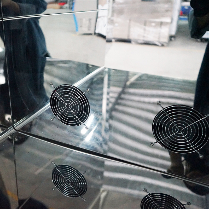 ♦ 环境舱内的温度调节系统,采用微电脑PID自动控制方式;箱体内的湿度由干湿比例 调节系统,通过控制湿度发生器内的湿度,使得通入工作室内的空气湿度为指定的湿度值,同时供气的置换率大小也会影响湿度的平衡时间。设备内部的风循环,采用后部轴流风机吸入,顶部均匀排出的设计方式。空气置换采用电磁压缩气泵供气,质量流量控制器控制流量。