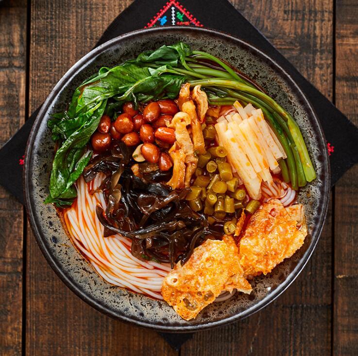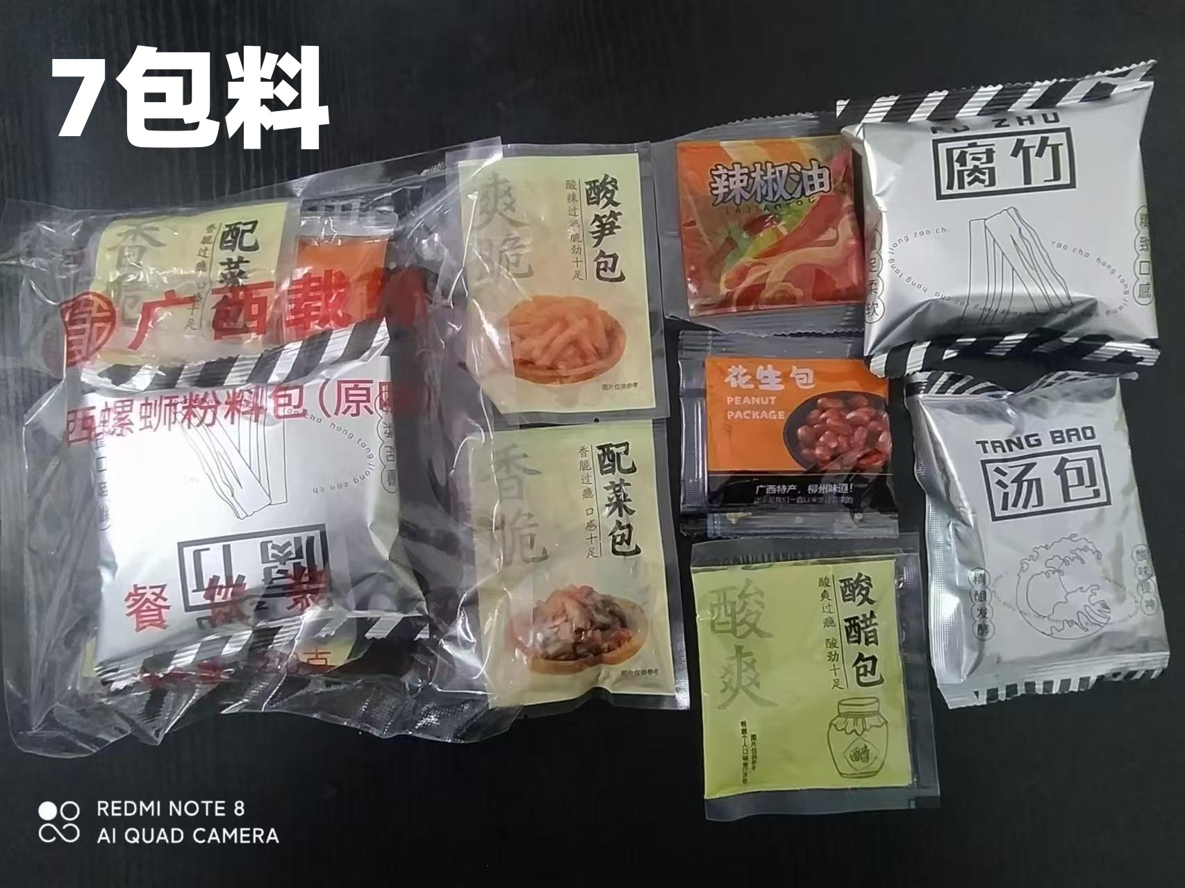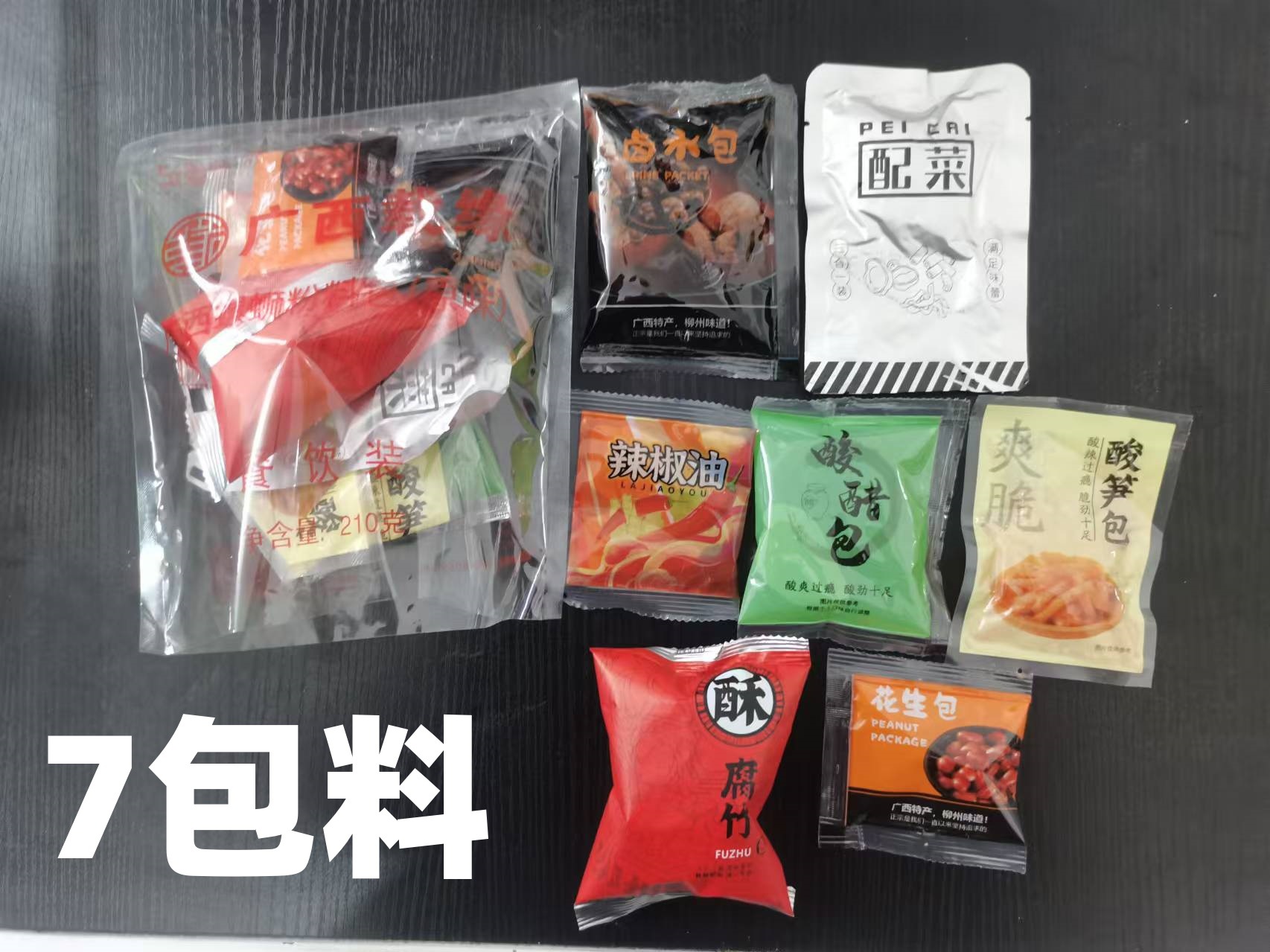 Пакетики супа, маринованные бобы, черный гриб, сушеная редька, кислые побеги бамбука, масло чили, юба, арахис, пакетики с уксусом