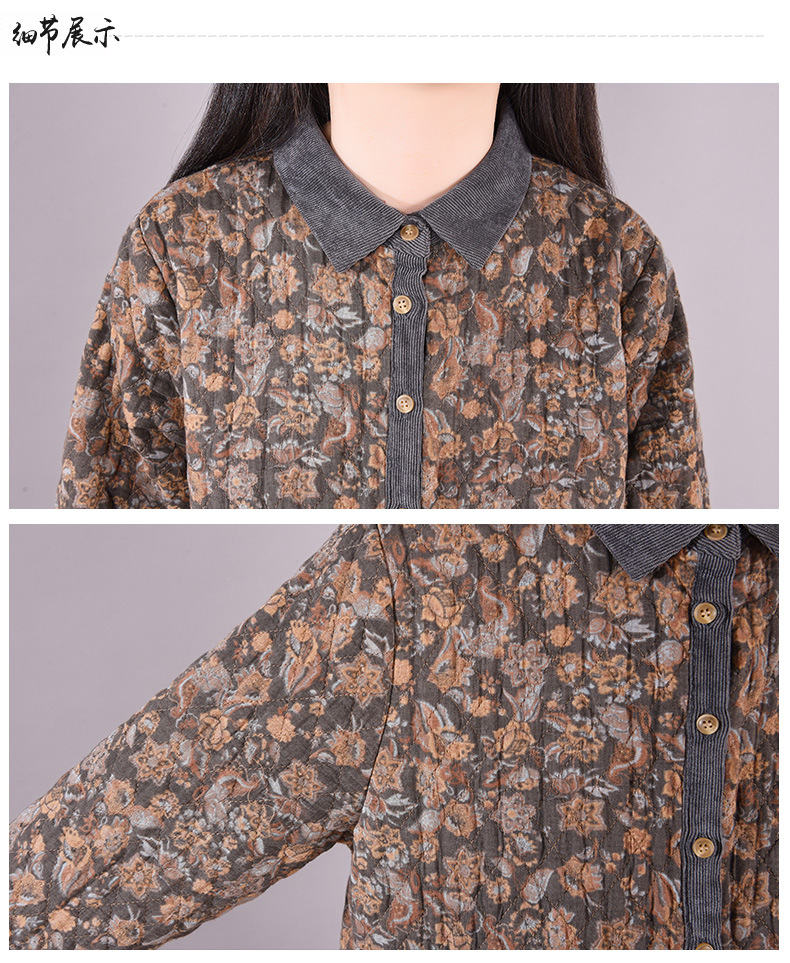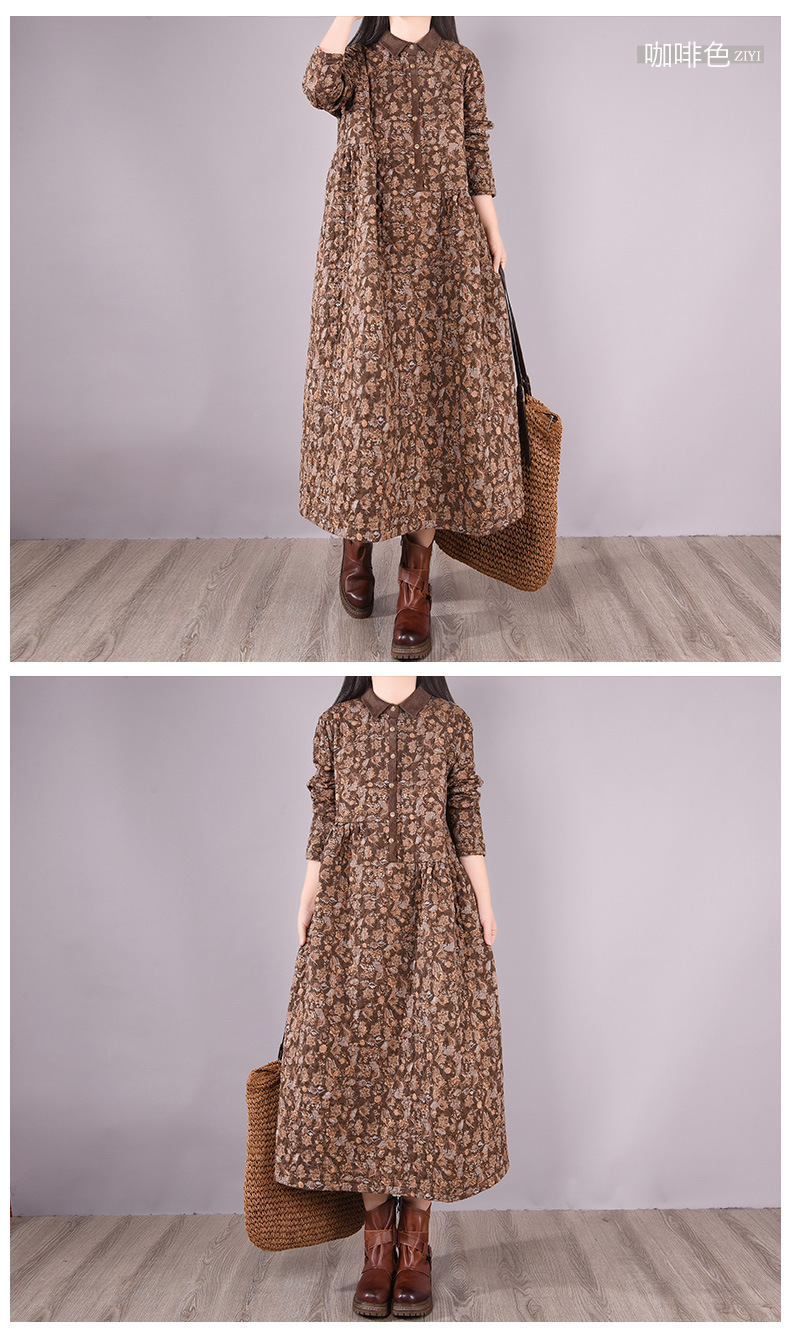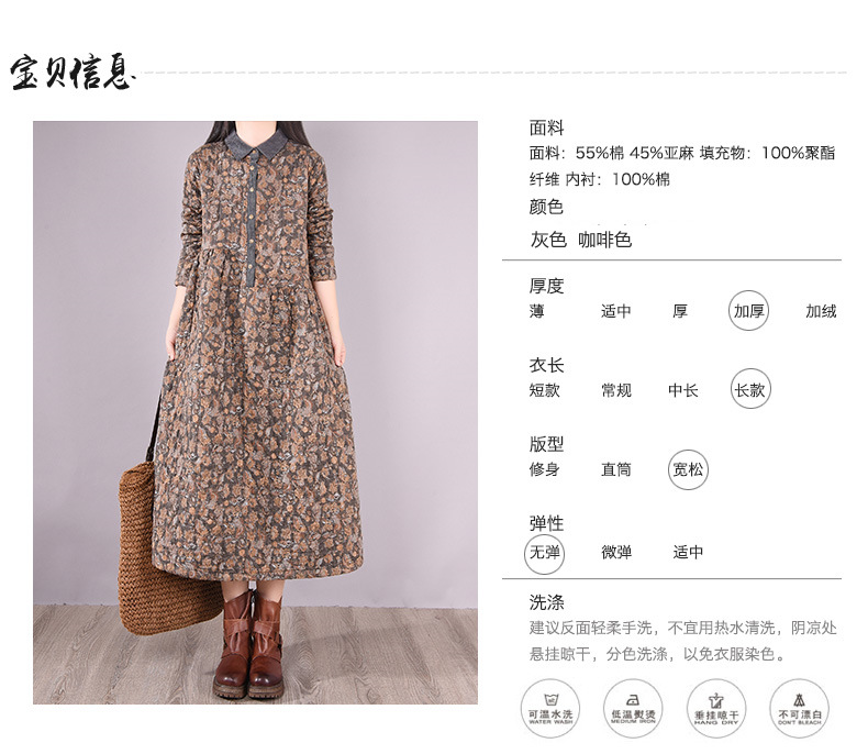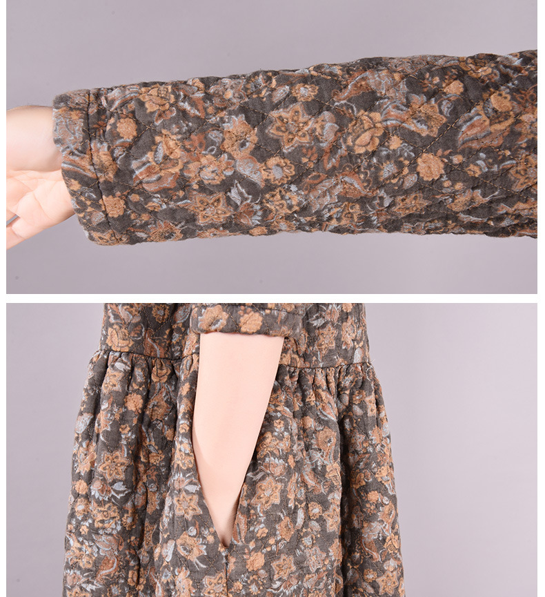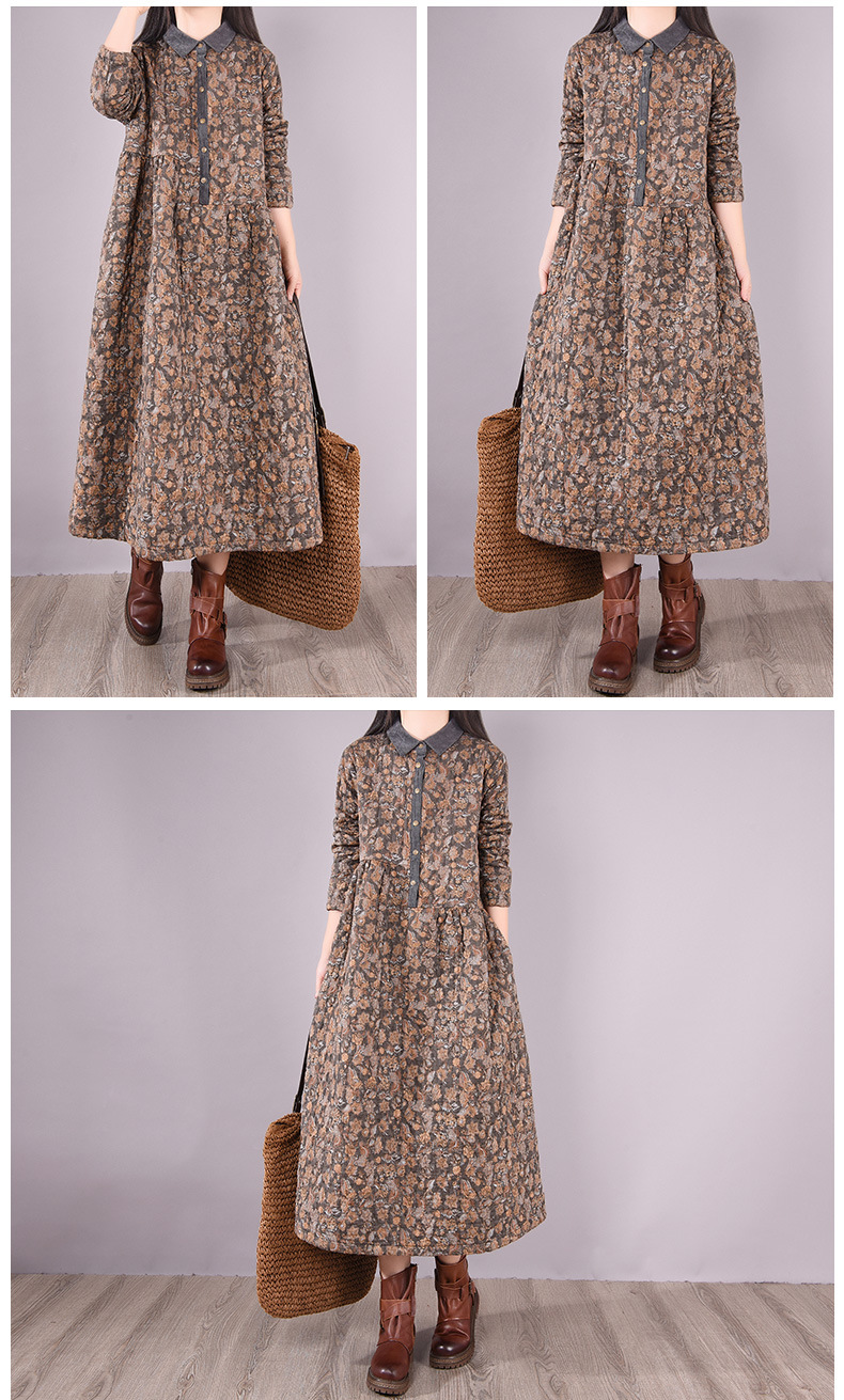 Фото реального образца: новое зимнее платье 2025 года в стиле ретро, свободного кроя, больших размеров, женское, комфортное, с цветочным узором, стеганое, из хлопка и льна.