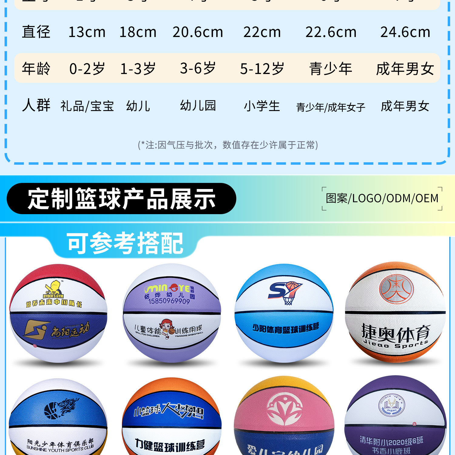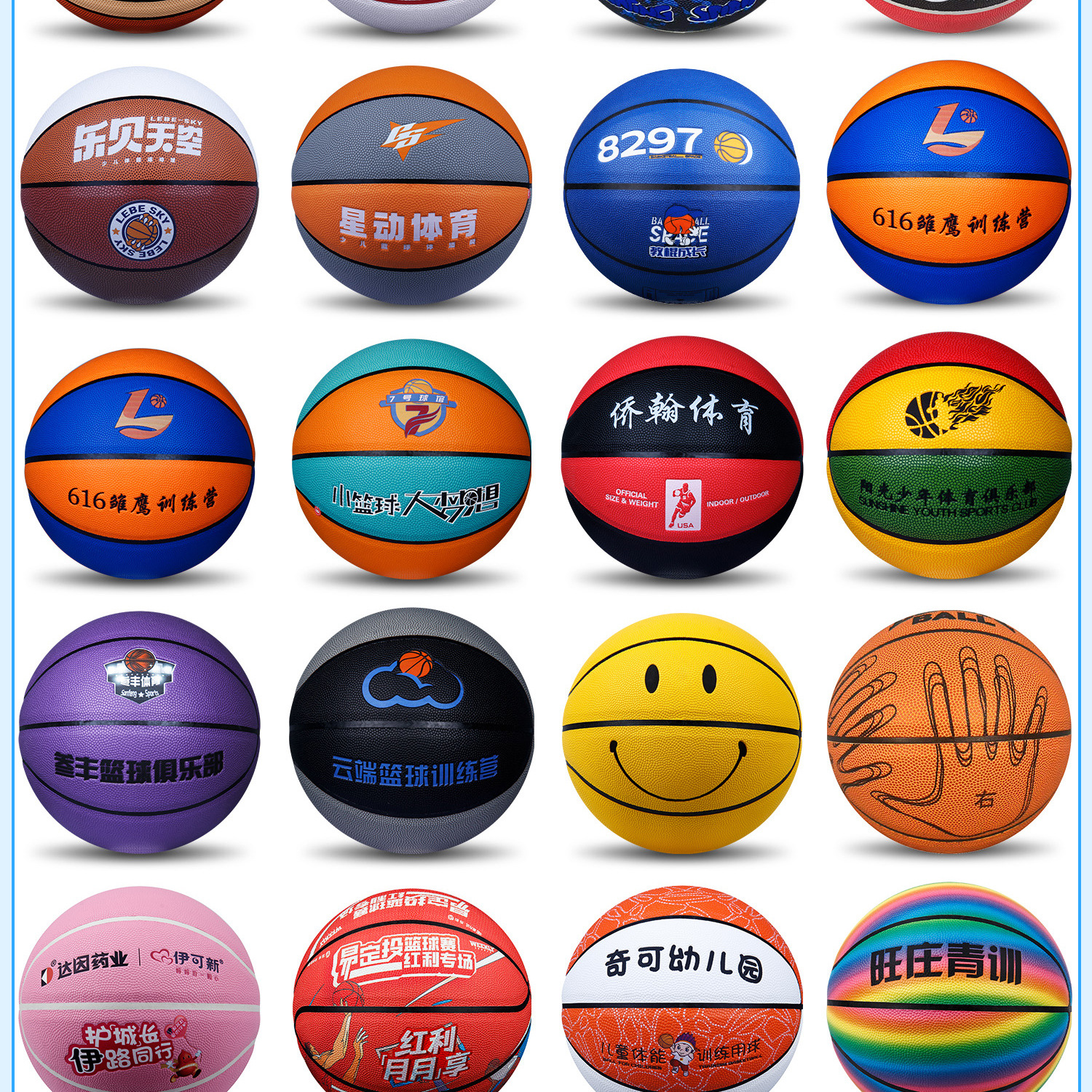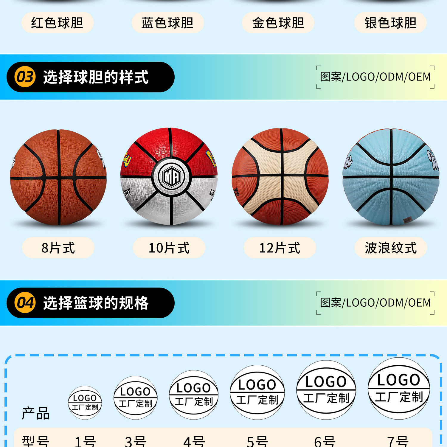 Баскетбол №7 (стандартный баскетбол); №6 Баскетбол (Женский баскетбол); Баскетбольный мяч №5 (молодежный мяч); Баскетбол №4 (Детский баскетбол); Баскетбольный мяч №3 (детский игровой мяч); Баскетбольный мяч №1 (памятный мяч)