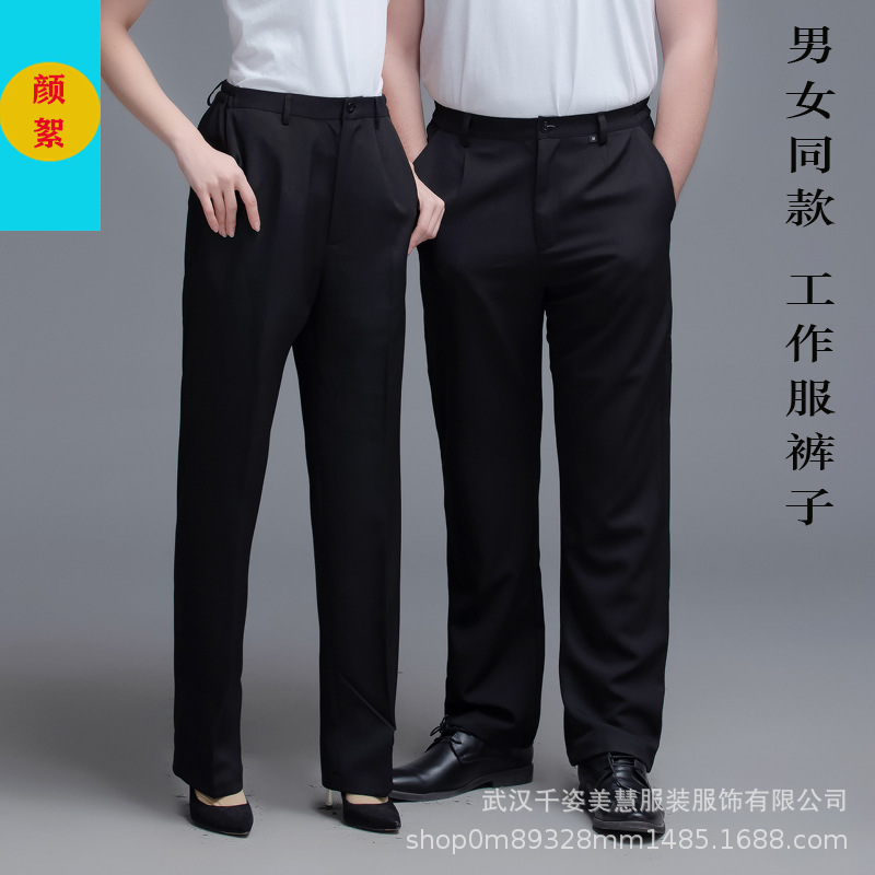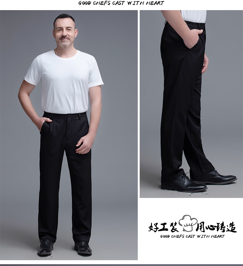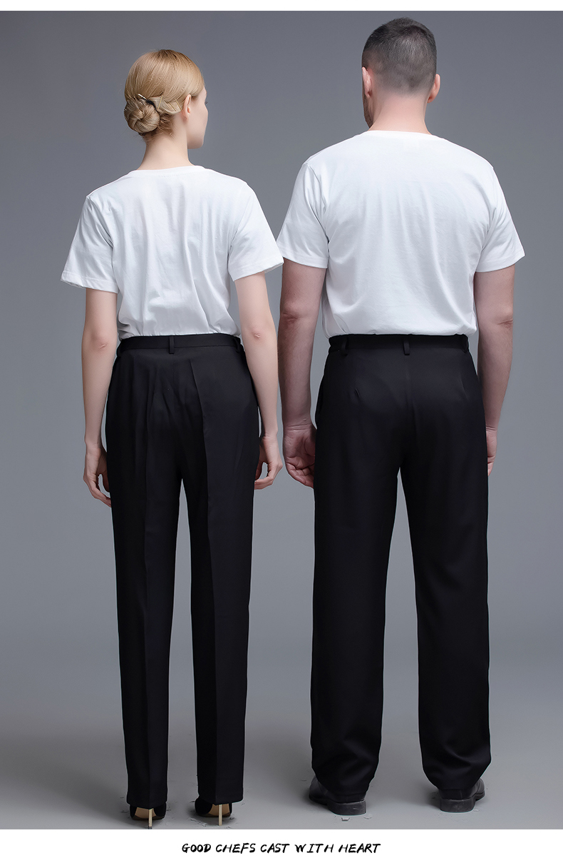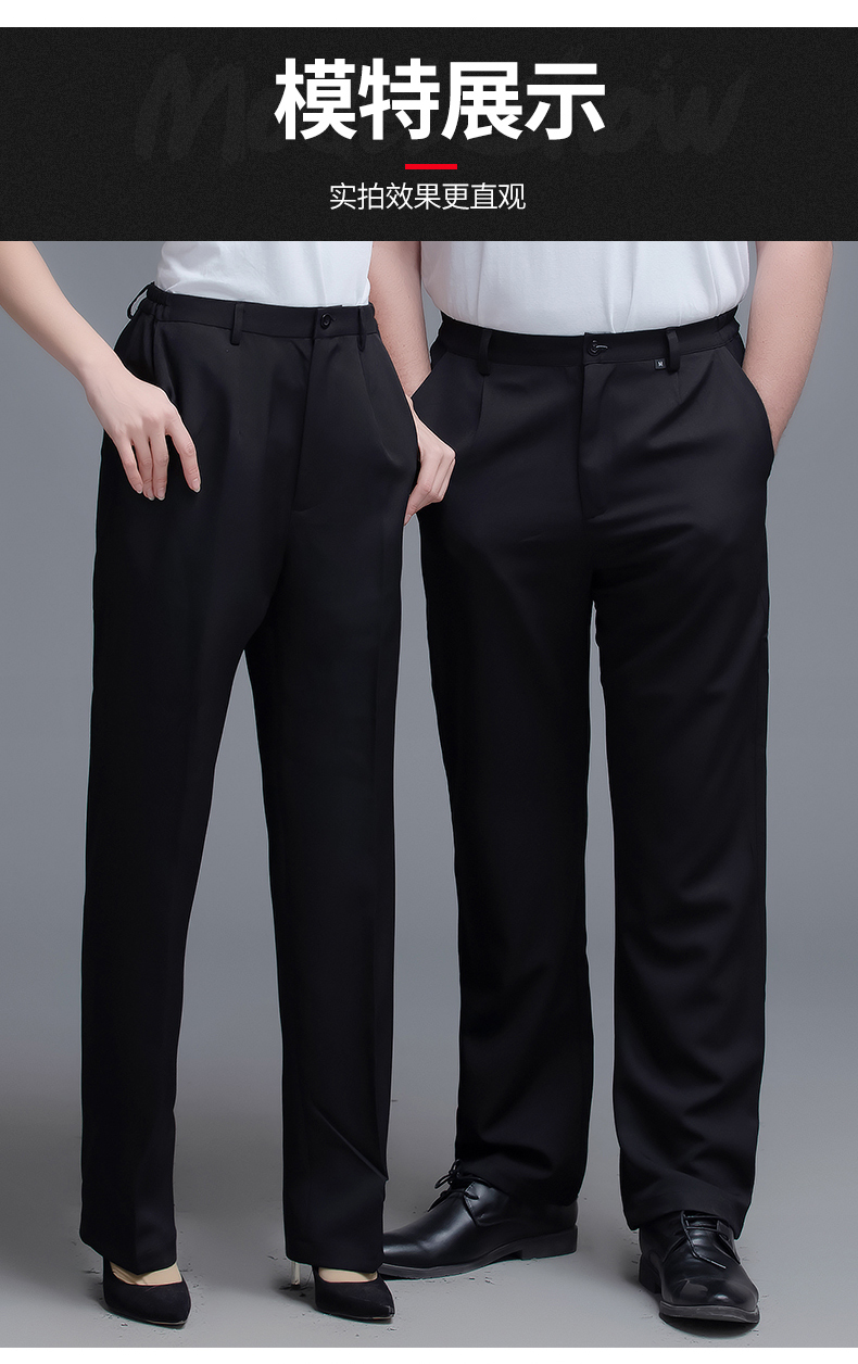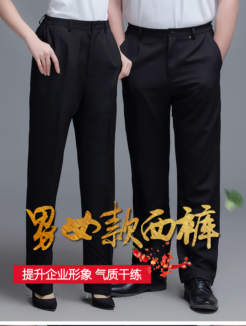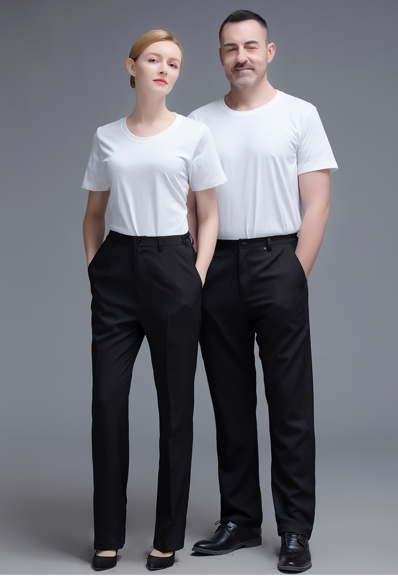 两侧带松紧西裤 腰围两侧带松紧 面料微弹 穿着有型 酒店厨房厨师裤子 中西餐厅 火锅店 奶茶蛋糕店男服务生女服务员 宾馆男女保洁员 银行 机场 车站 商场 超市 员工 工作服裤子