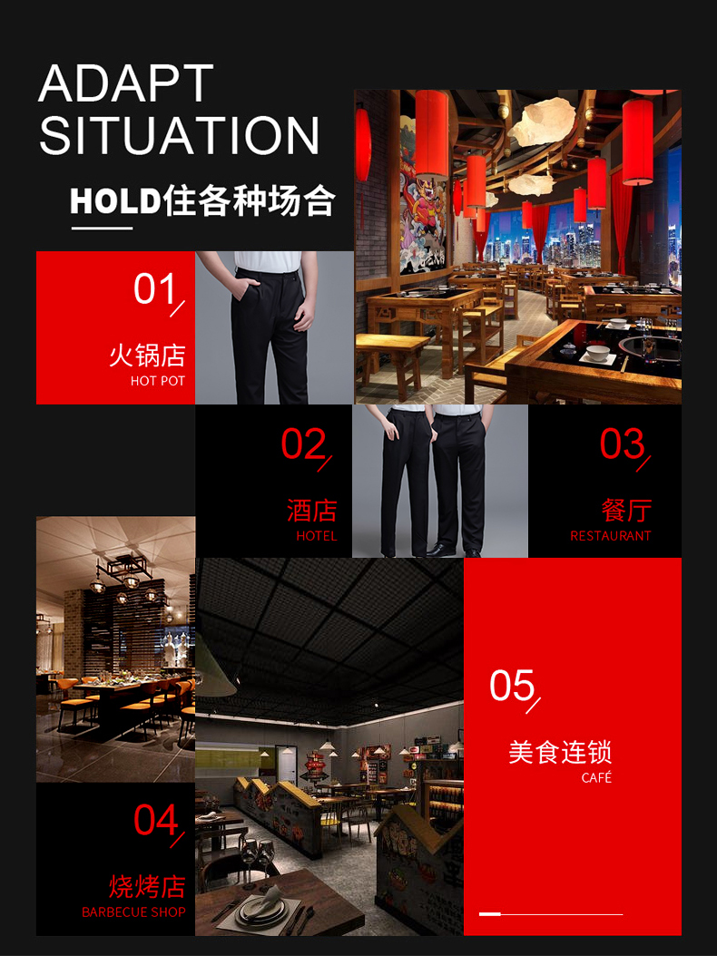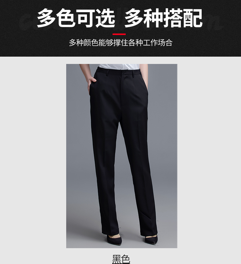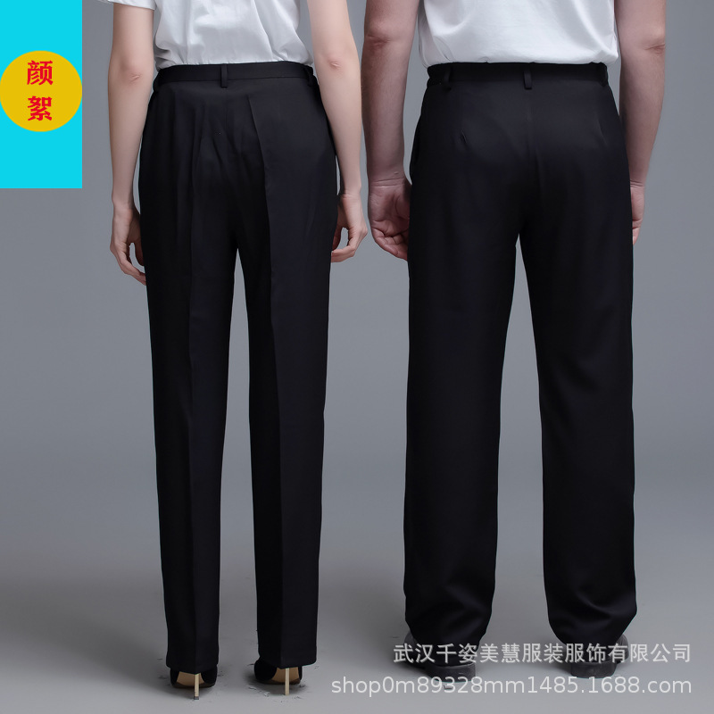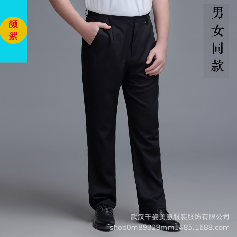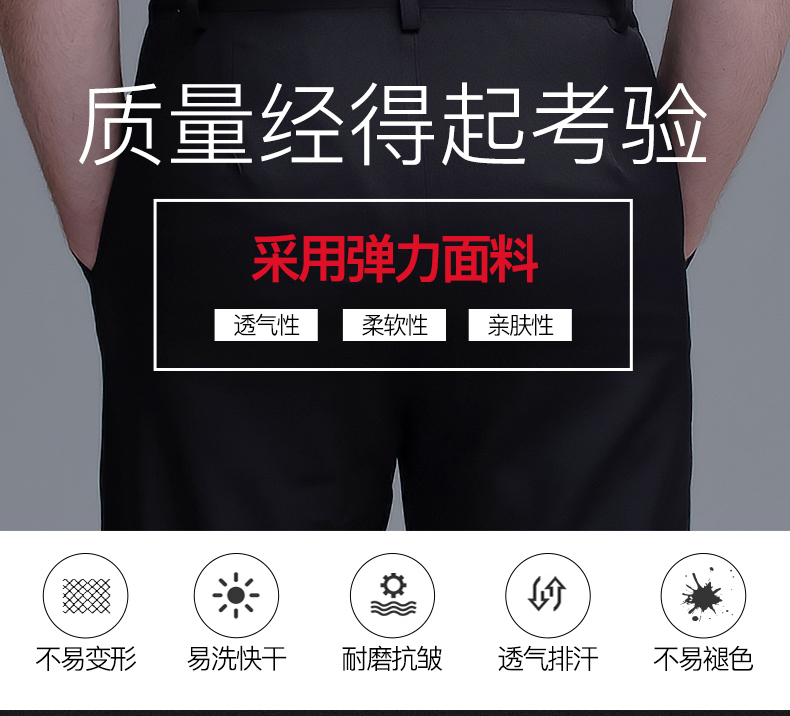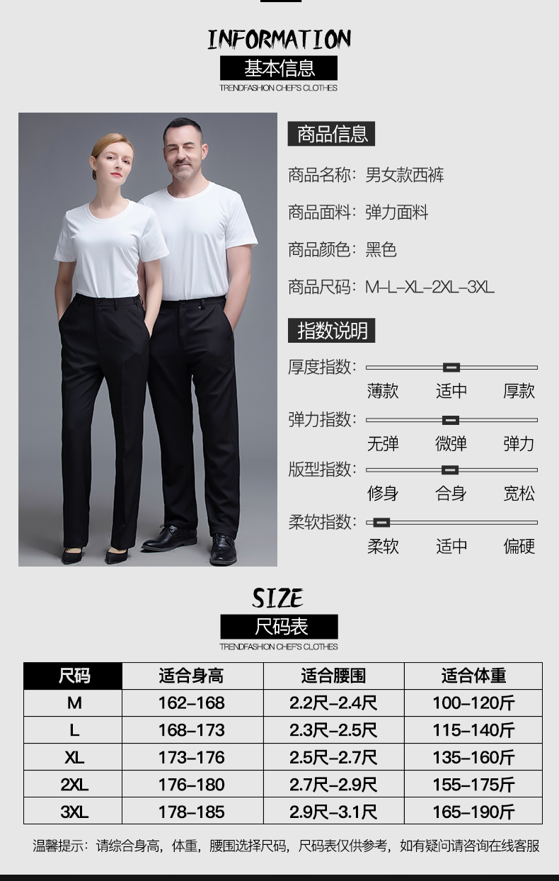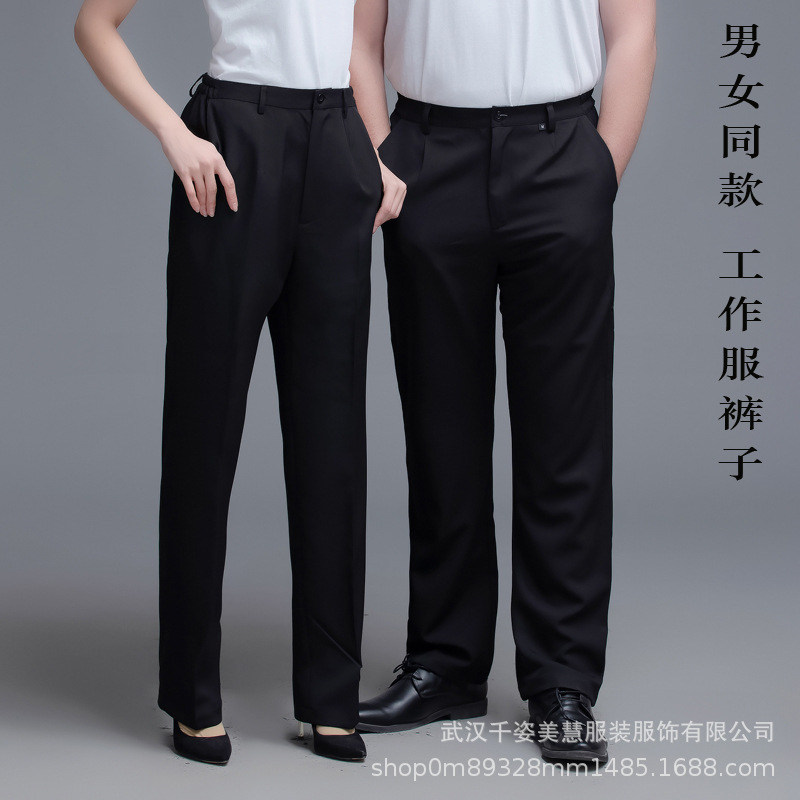 两侧带松紧西裤 腰围两侧带松紧 面料微弹 穿着有型 酒店厨房厨师裤子 中西餐厅 火锅店 奶茶蛋糕店男服务生女服务员 宾馆男女保洁员 银行 机场 车站 商场 超市 员工 工作服裤子