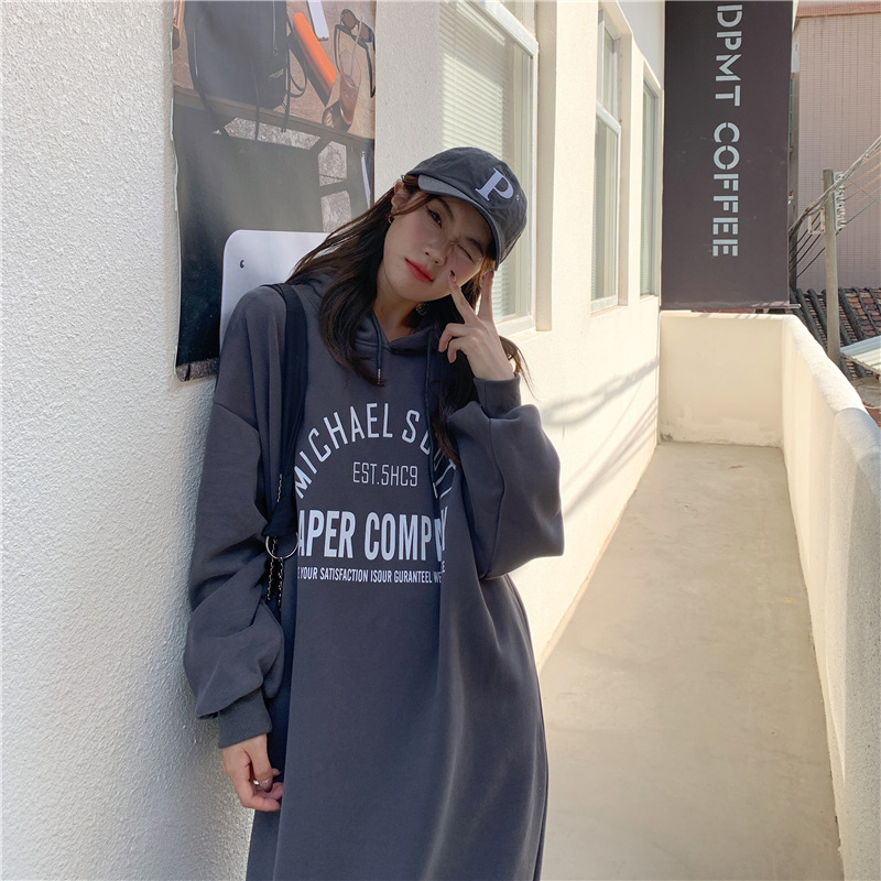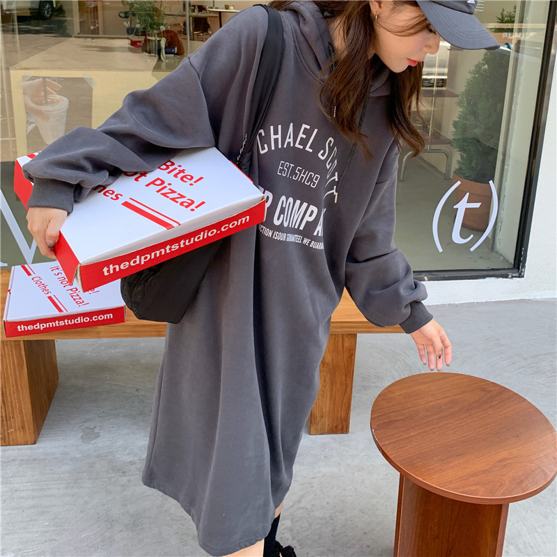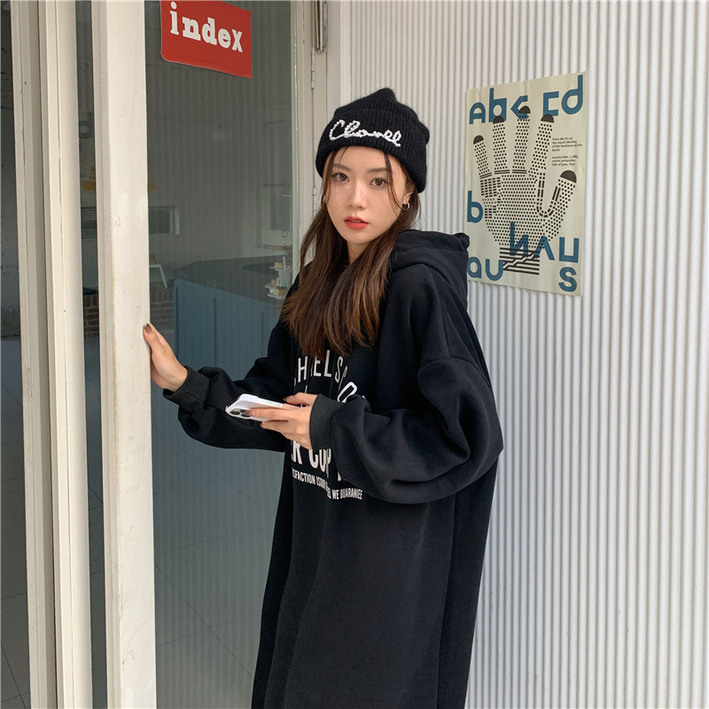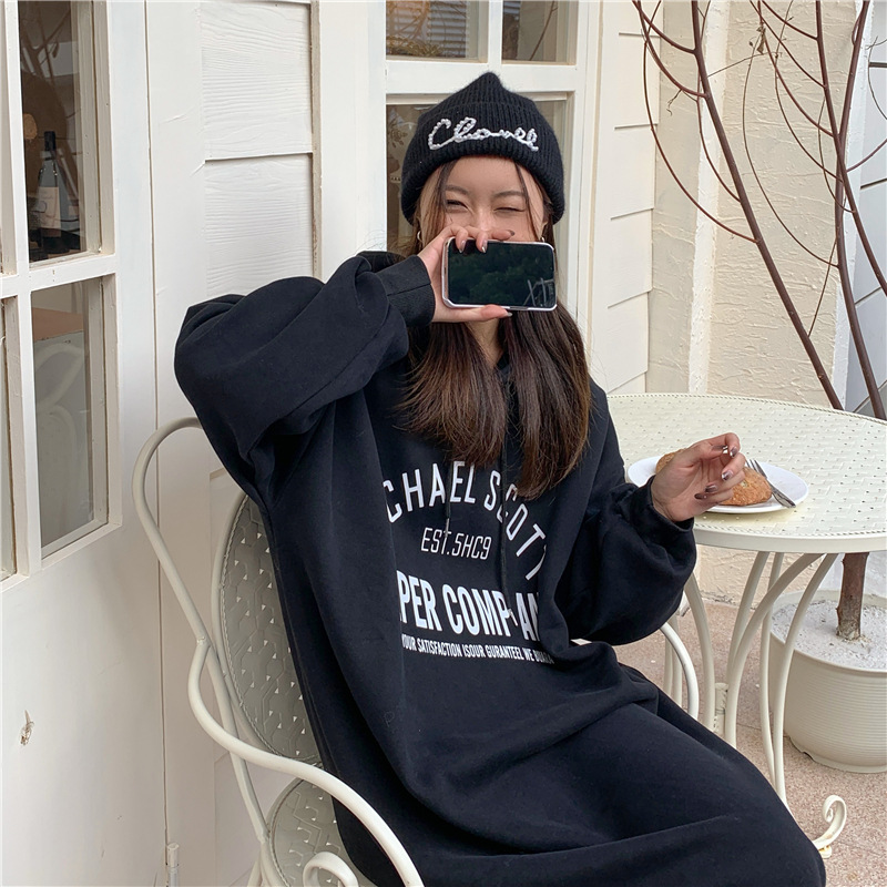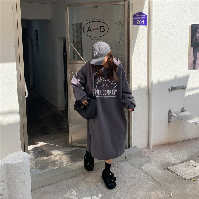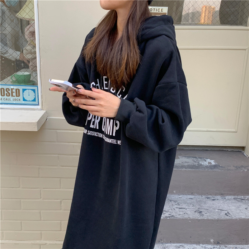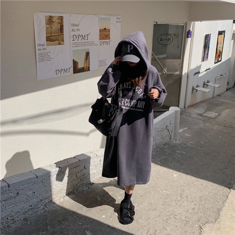 Длинный утолщенный свитер выше колена с капюшоном на флисовой подкладке с буквенным принтом, юбка, зимнее свободное толстое пальто больших размеров, стильное ленивое пальто для женщин