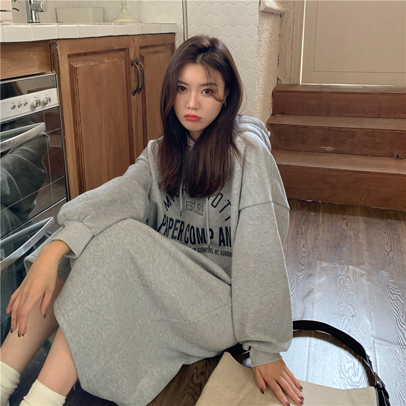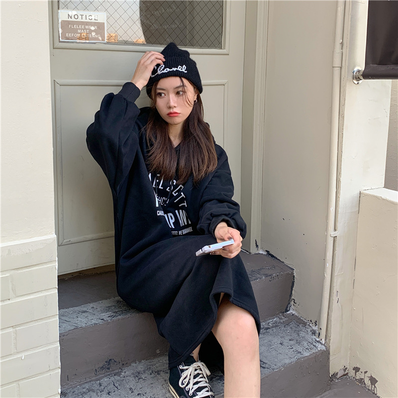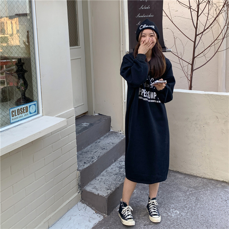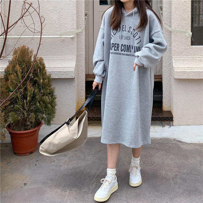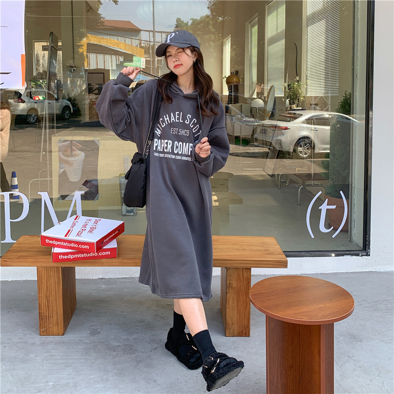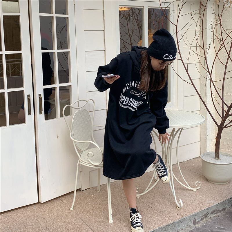 Длинный утолщенный свитер выше колена с капюшоном на флисовой подкладке с буквенным принтом, юбка, зимнее свободное толстое пальто больших размеров, стильное ленивое пальто для женщин