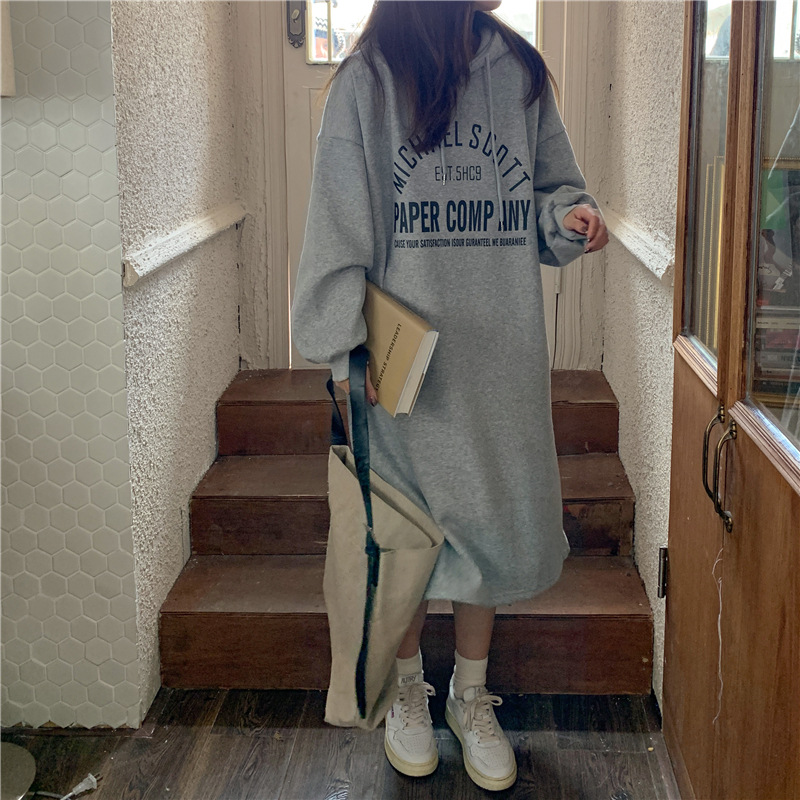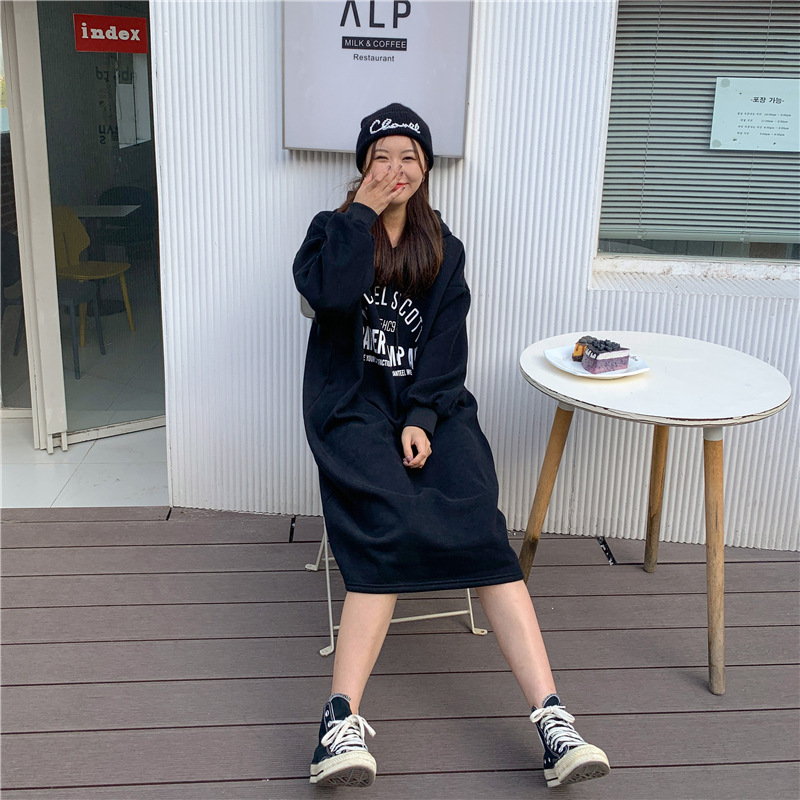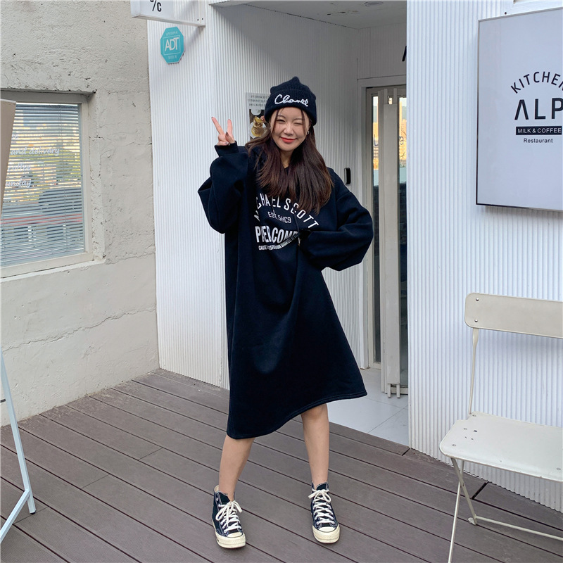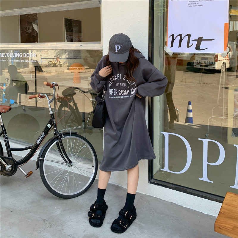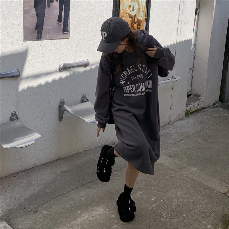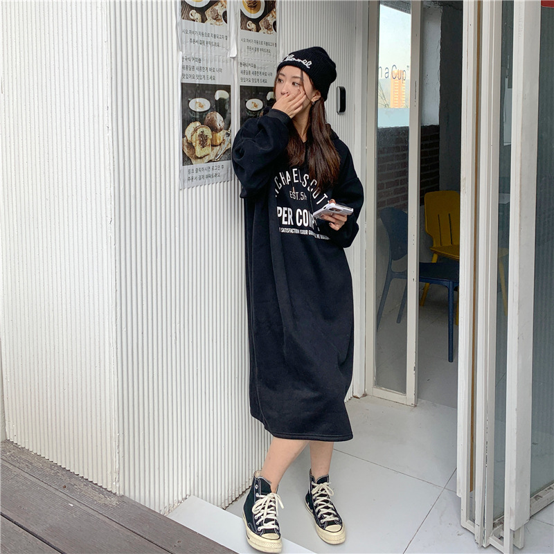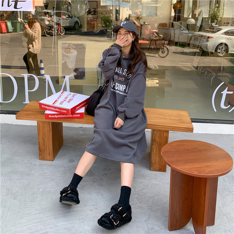 Длинный утолщенный свитер выше колена с капюшоном на флисовой подкладке с буквенным принтом, юбка, зимнее свободное толстое пальто больших размеров, стильное ленивое пальто для женщин
