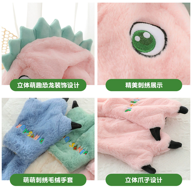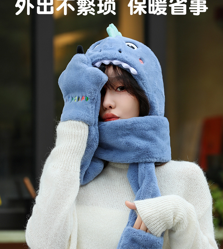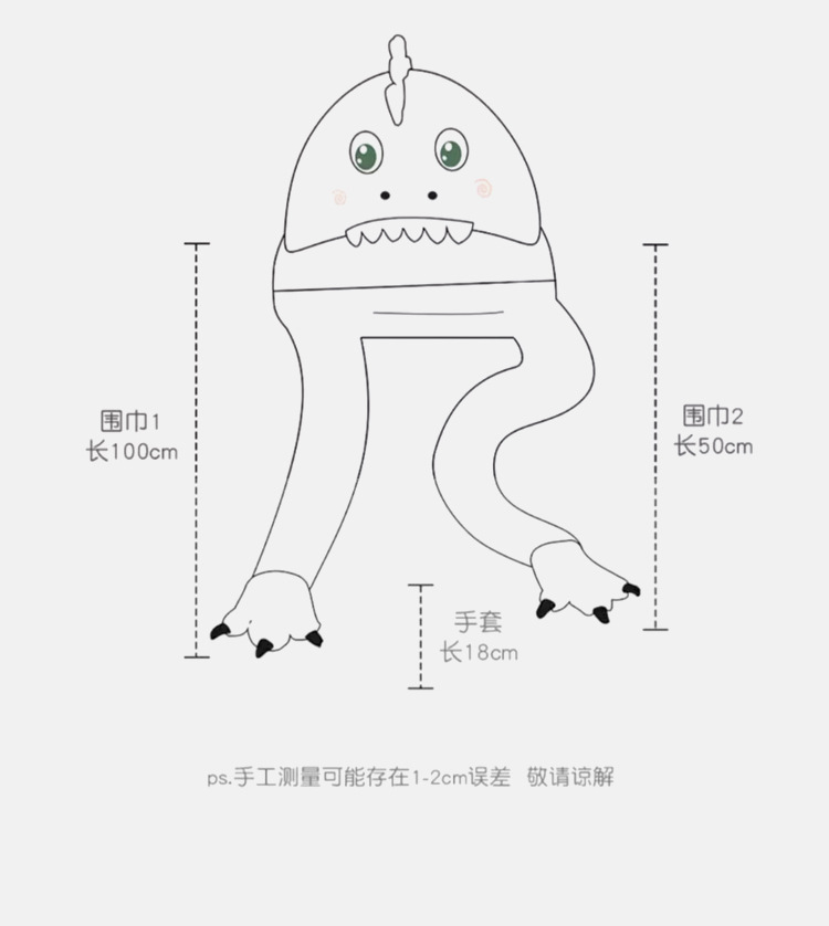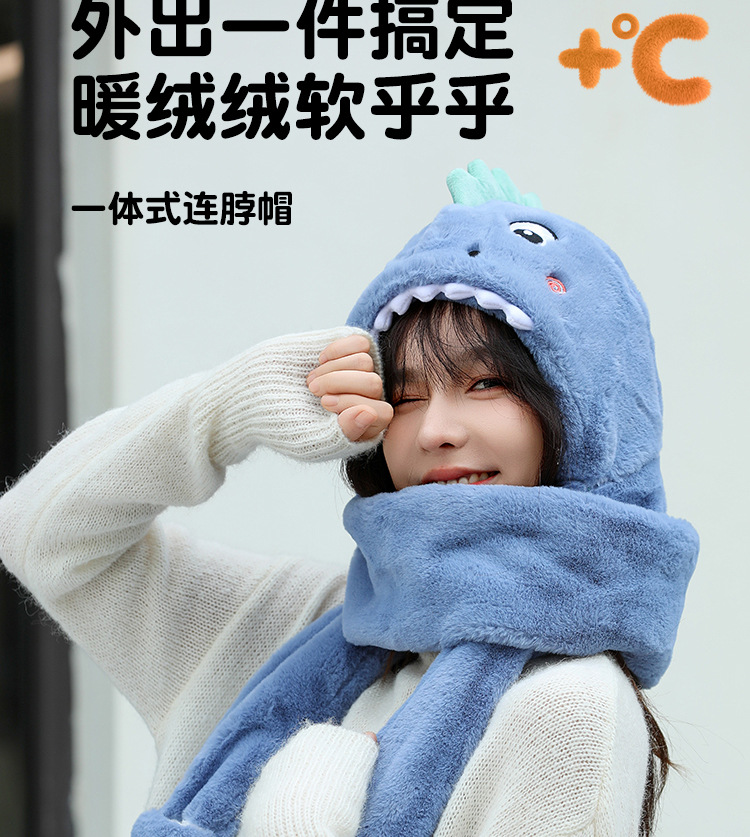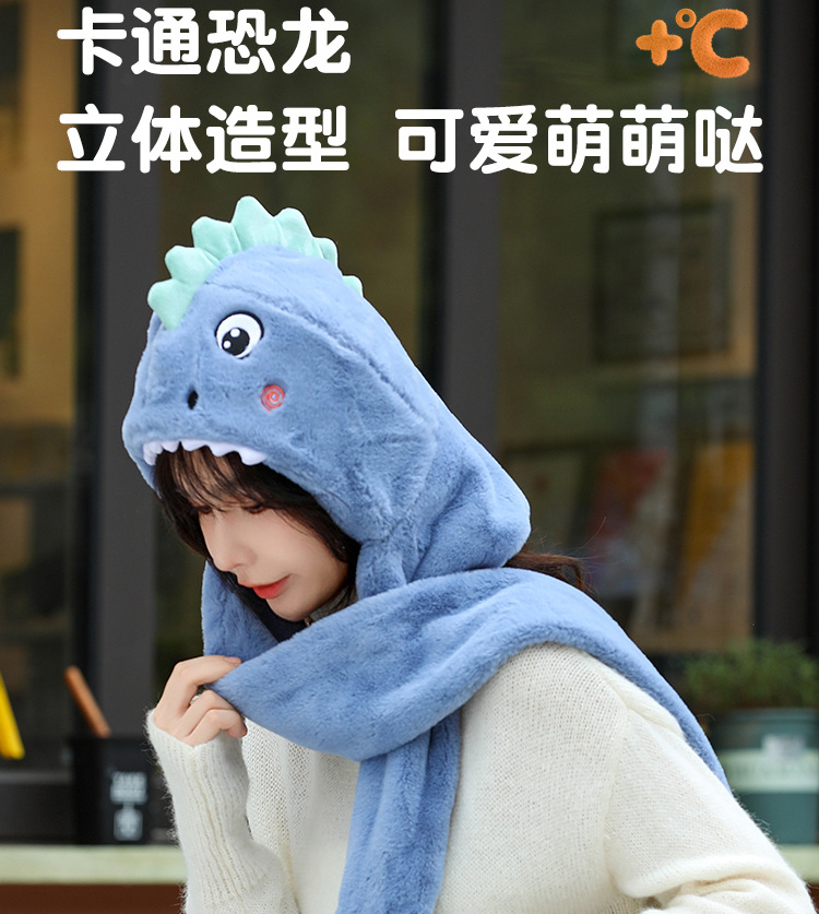 Теплый комплект из трех предметов: шапка и шарф с изображением маленького динозавра, интегрированная шейная подогревающая подкладка и шапка, в наличии, флисовая подкладка, для улицы.