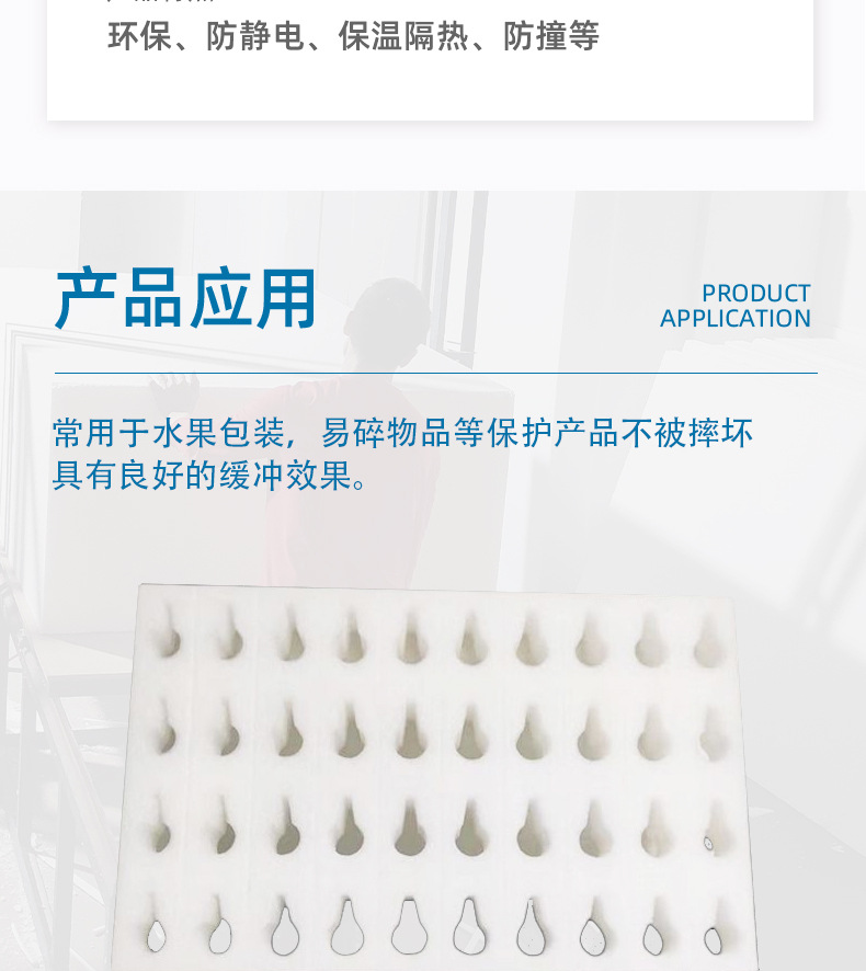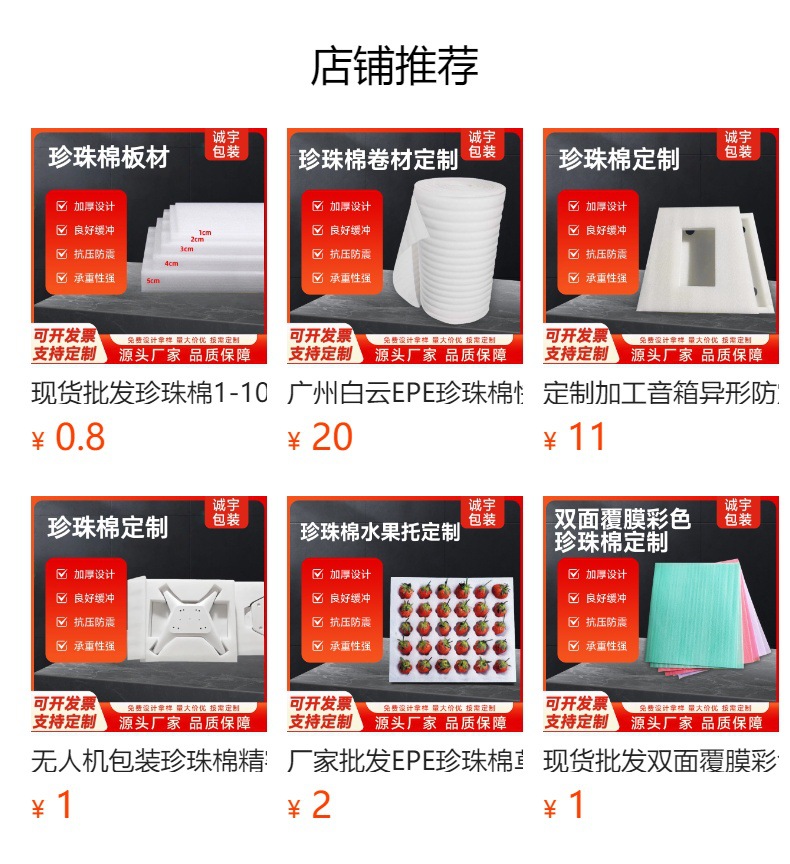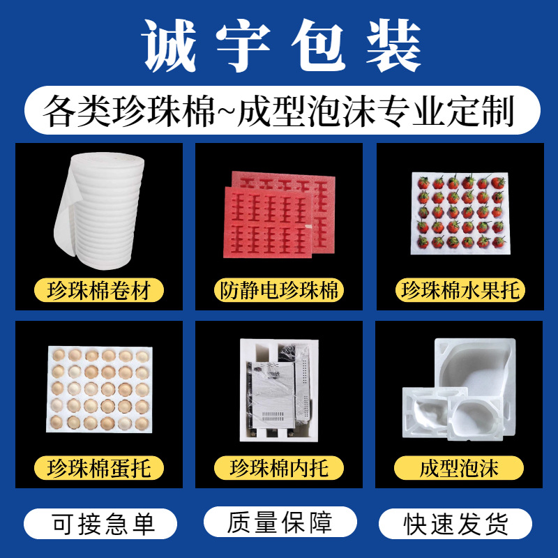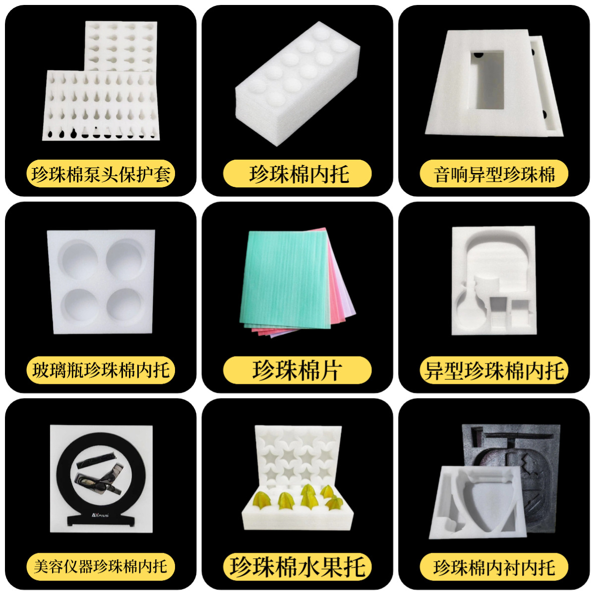 主营定制产品有:珍珠棉板材、片材、珍珠棉泵头、护边护角、异型珍珠棉、珍珠棉内衬、水果托、鸡蛋托、免模泡沫、成型泡沫等各种泡沫、珍珠棉包装定制
