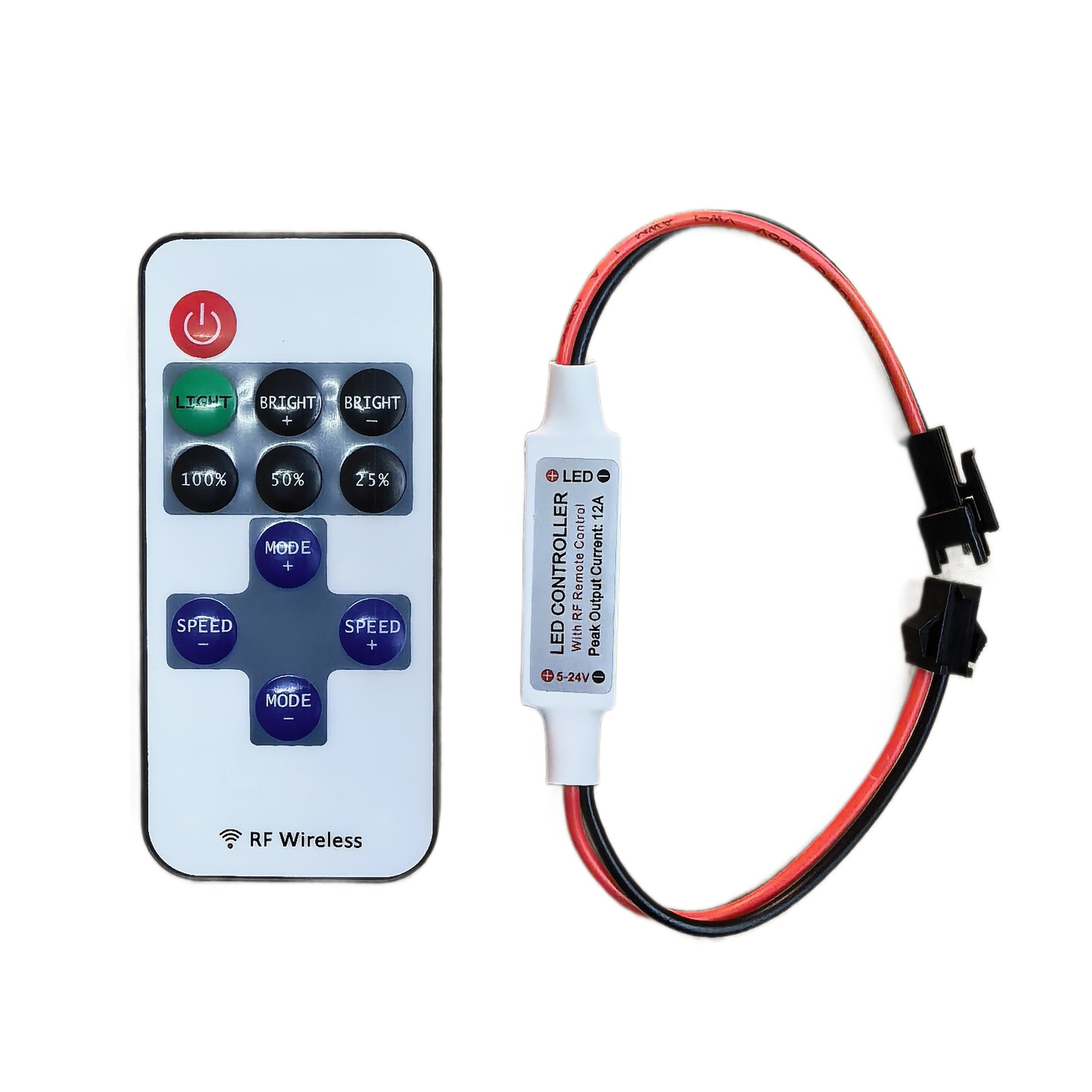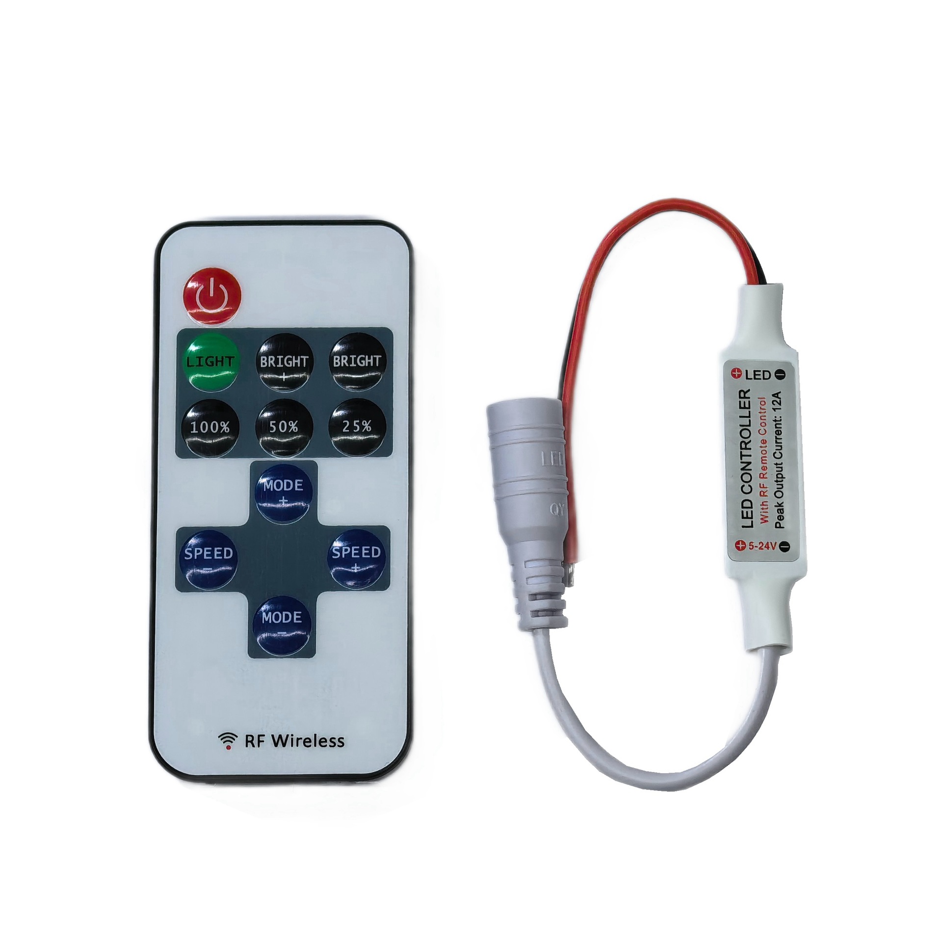 此款控制器采用先进电脑控制芯片,通过433MHz无线信号进行控制,用于控制各种以led为光源的单色灯具,例如:点光源,软光条,洗墙灯,玻璃幕墙灯等;具有价格低廉,接线方便,使用简单等优点;根据客户要求,可实现单路静态十级亮度调节,8种单色动态模式,可实现爆闪、呼吸、渐明渐暗、频闪、闪烁等多种模式,并有10级调速,速度跨度大,控制器具有携带方便,使用简单等特点