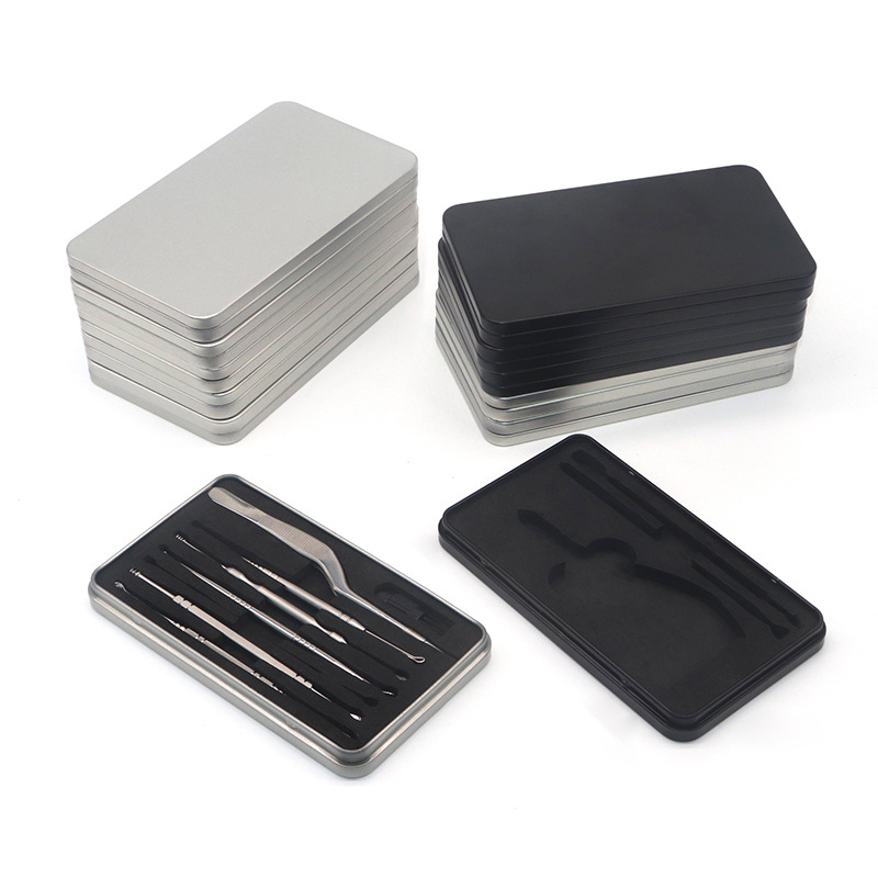 Прямоугольная серебряная жестяная коробка для хранения кусачек для ногтей, кусачек для кутикулы и ножниц для ногтей.