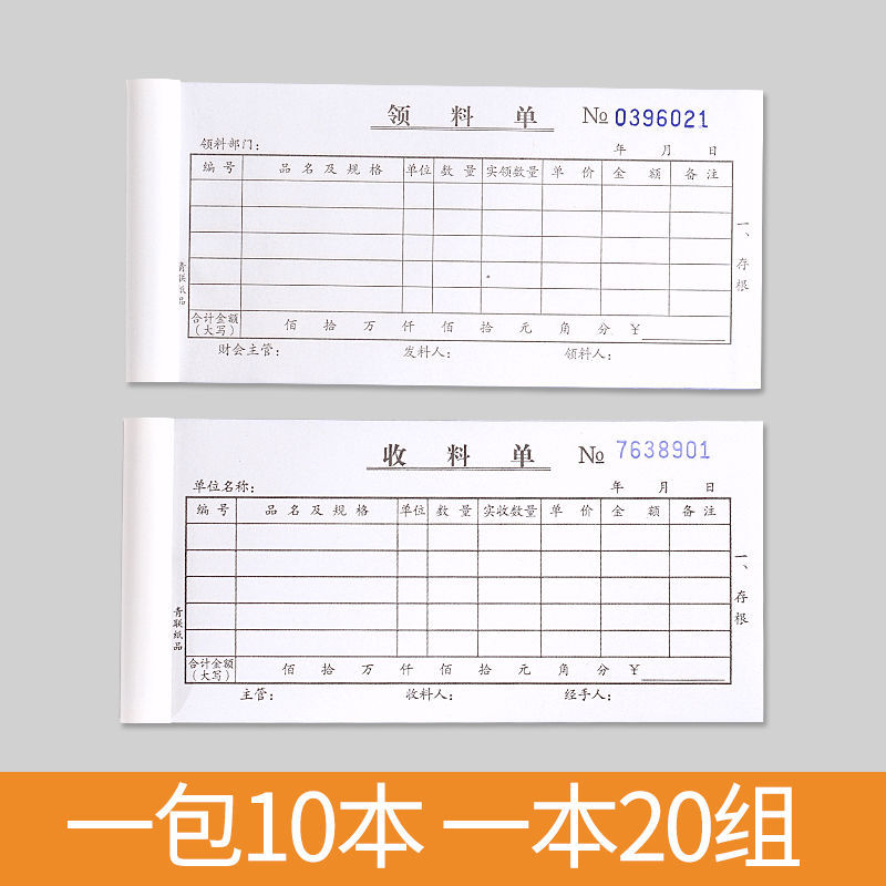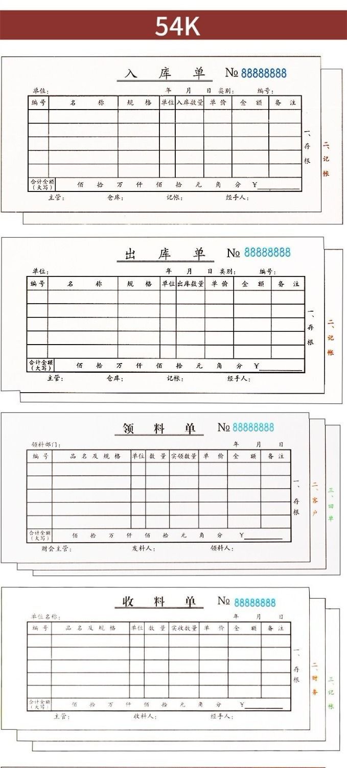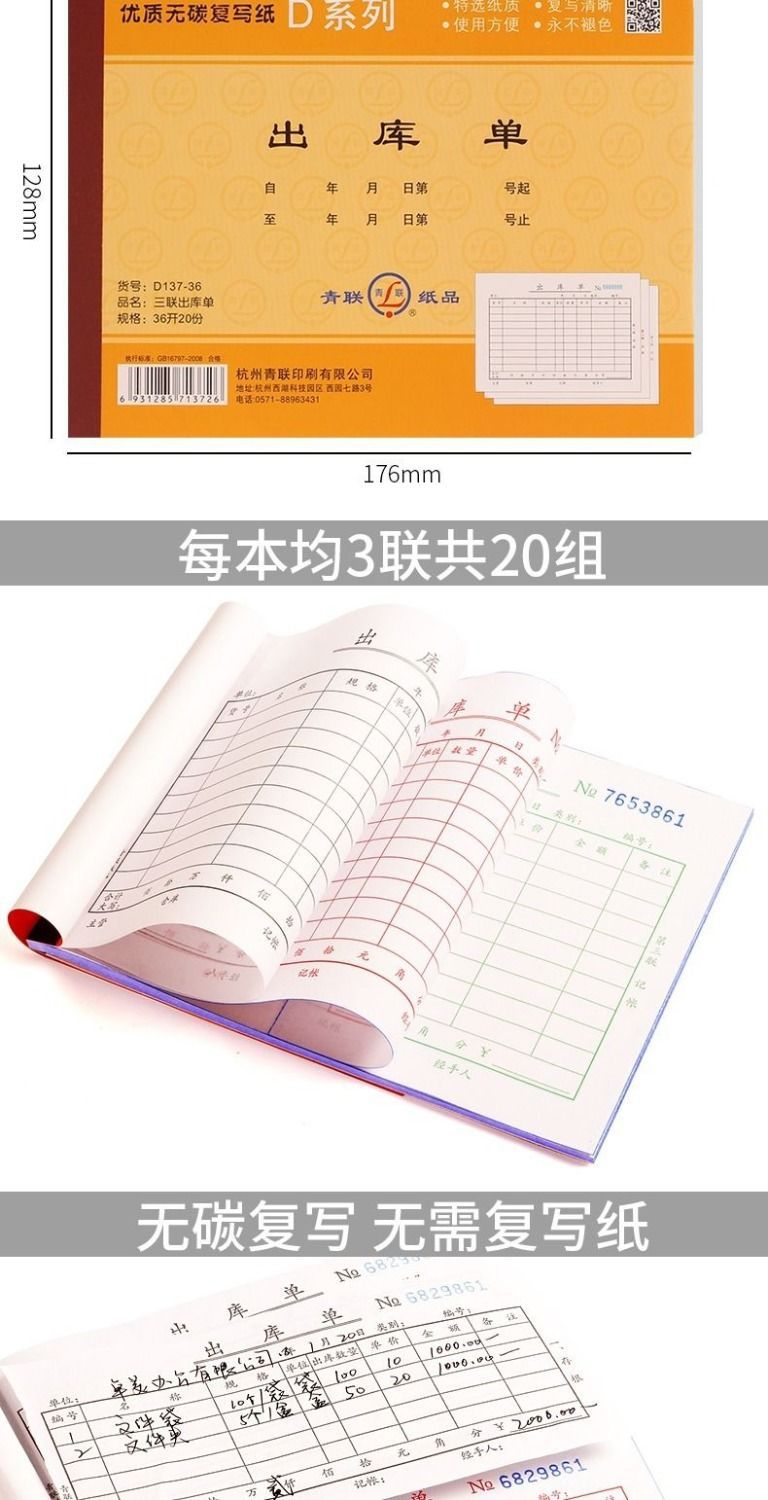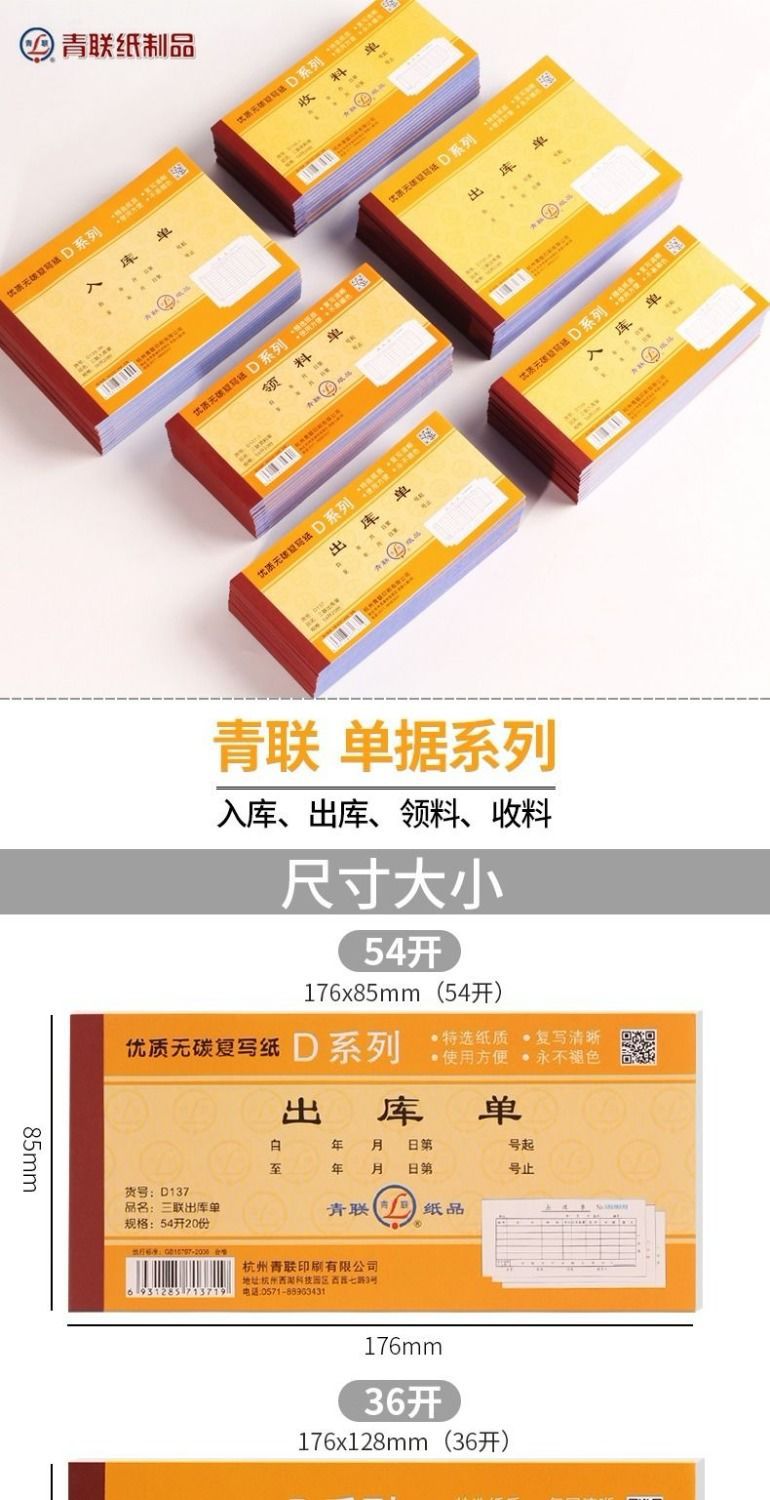 青联无碳复写出入库单,领料单,收料单。54K是常规收据大小的尺寸,36K是大号的尺寸哦。如有疑问可以咨询客服。
