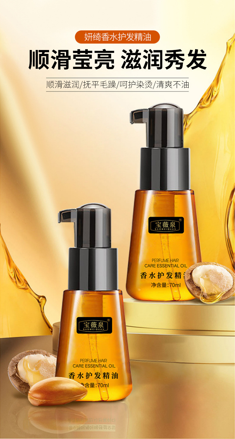 Тщательно отобранное эфирное масло Baoweiquan для ухода за волосами, увлажняющее и питательное, против пушистости, смягчающее, ароматизированное эфирное масло для ухода за волосами.