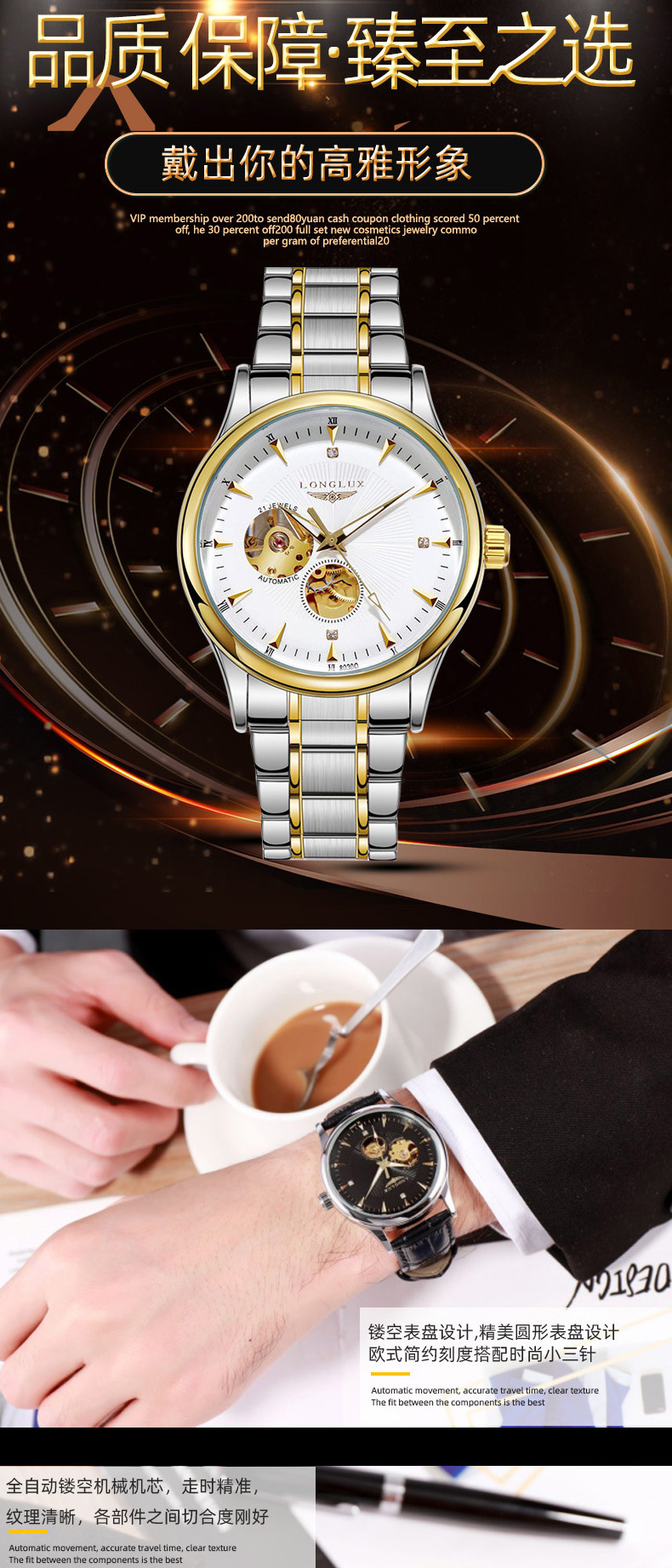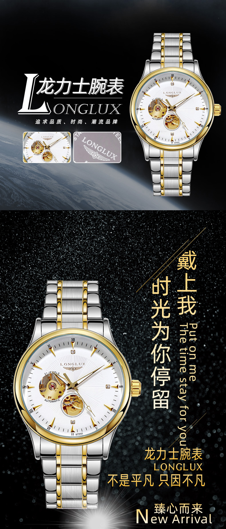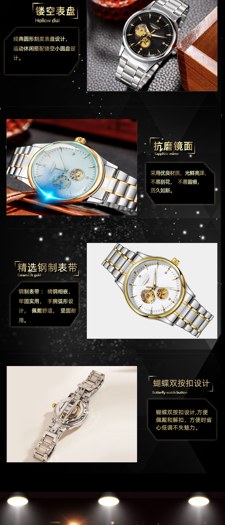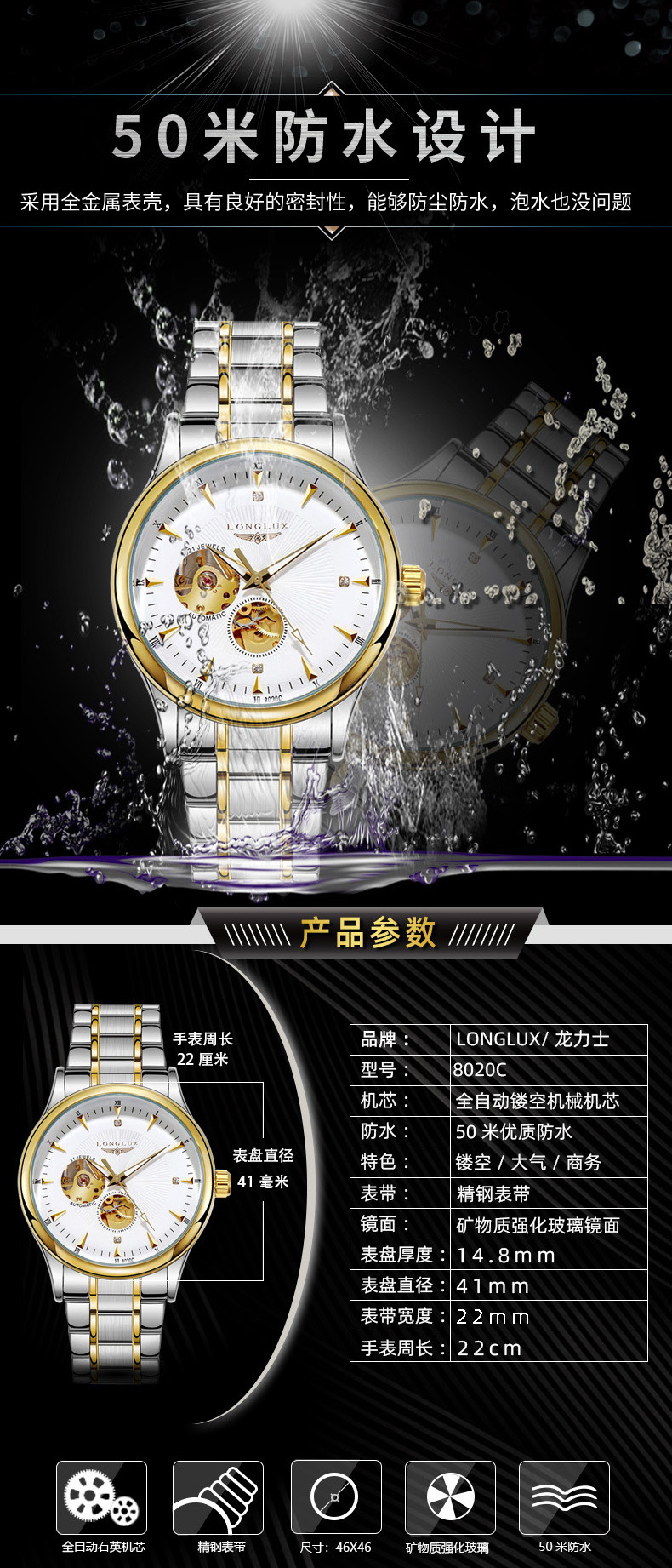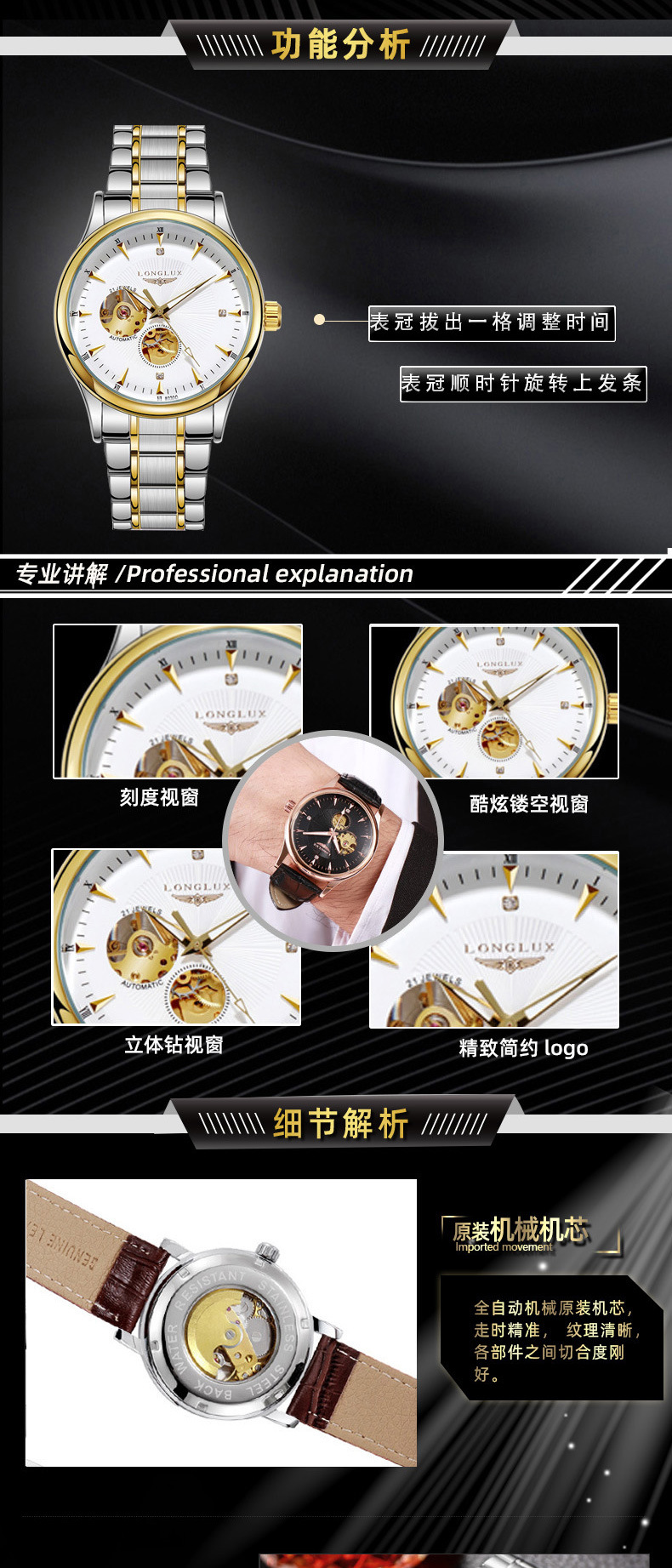LONGLUX полые мужские водонепроницаемые часы бизнес автоматические механические часы жить мужской часы завод подгонять
