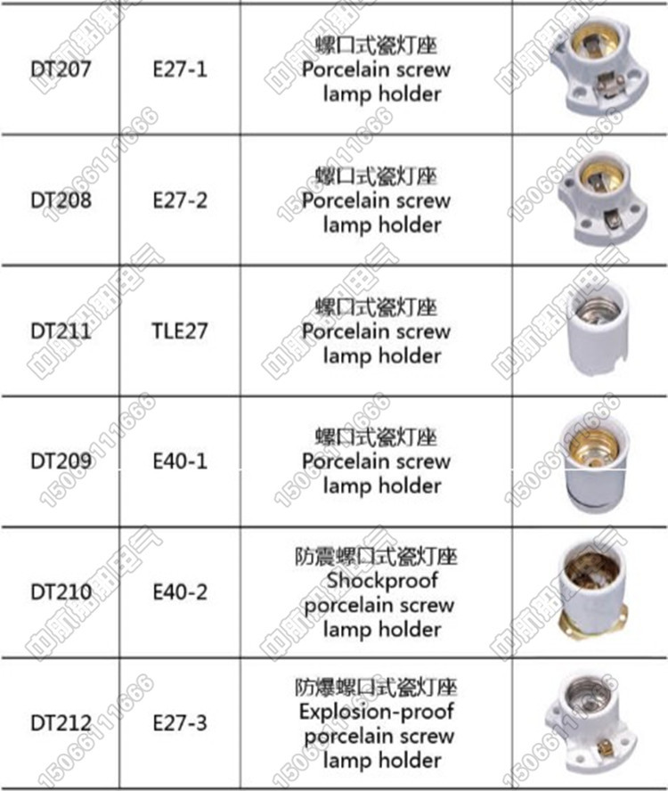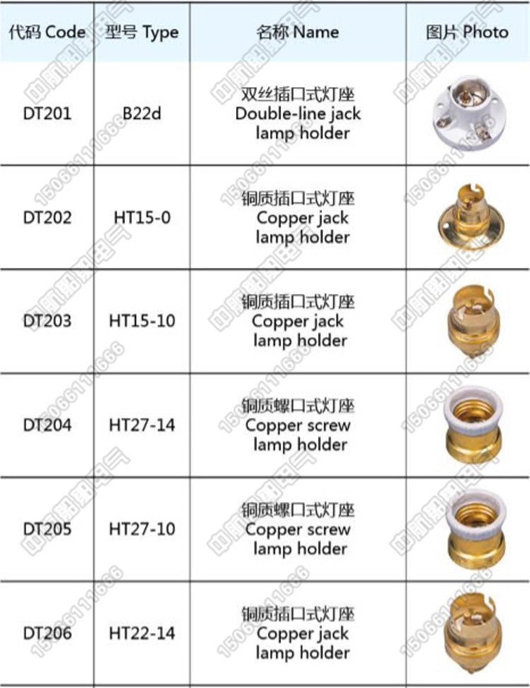 DT207/E27-1/винтовой керамический держатель лампы; Байонетный керамический патрон для ламп FB-22; DT208/E27-2/винтовой керамический держатель лампы; DT211/TLE27/винтовой керамический держатель лампы; DT209/E40-1/винтовой керамический держатель лампы; DT210/E40-2/винтовой керамический патрон с прямой железной планкой внизу; E40-3/винтовой керамический держатель лампы; DT220/P28S/патрон для прогулочной лампы; DT221/BAY15/держатель прогулочной лампы; 793502/FB-15/патрон лампы с розеткой; 793504/FE-26/винтовой держатель лампы; DT201/B22D/Двухпроводной патрон лампы с цоколем; DT202/HT15-0/патрон с медным цоколем; DT203/HT15-10/патрон с медным цоколем; DT204/HT27/медный винтовой патрон лампы; Патрон лампы DT206/HT22/медный цоколь; DT216/G13-A/патрон люминесцентной лампы; DT217/G13-B/патрон люминесцентной лампы; 100585/250 В/1 А держатель фонаря для стихийного бедствия; 100588Патрон люминесцентной лампы; Патрон лампы TG8 G6.35; Патрон лампы GX9.5; стартовая база; Взрывозащищенный держатель люминесцентной лампы CFY; Ножки люминесцентной лампы G13-F41