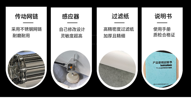 纸带过滤机是依靠液体自身的重力透过滤布,隔离杂物,从而达到净化液体目的。传动机构的链条、丝网形成一定的液池深度,滤布铺在链条、丝网上。工作时携有杂质的污液通过水流缓冲装置流到无纺布上时,杂质被滤布隔离形成滤饼,滤饼越来越厚,污液液面上升,浮起液位控制器发讯,减速机启动,拖动滤布,污物及脏布落入脏纸箱,从而实现滤布的自动更换;滤布更新后污液液面下降,减速机停止转动,机器进入下一步过滤循环。过滤后的纯净液体由液泵输送至主机。