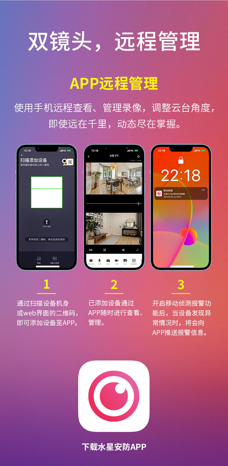 双驱动马达,360°视角,支持APP远程操纵云台,可随时随地查看监控视频。