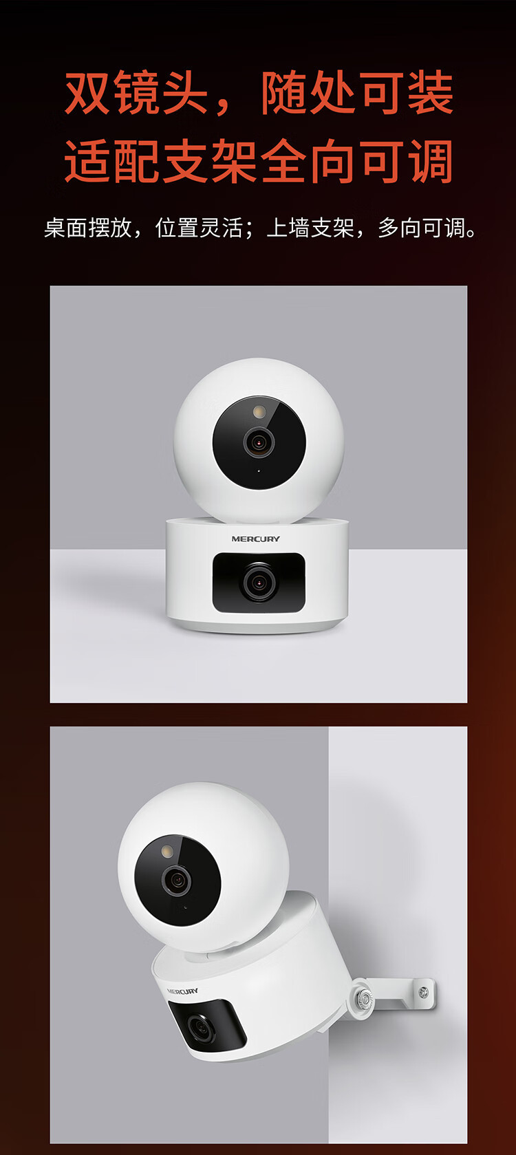 搭配可旋转支架,支持壁挂、吸顶安装,灵活便捷。