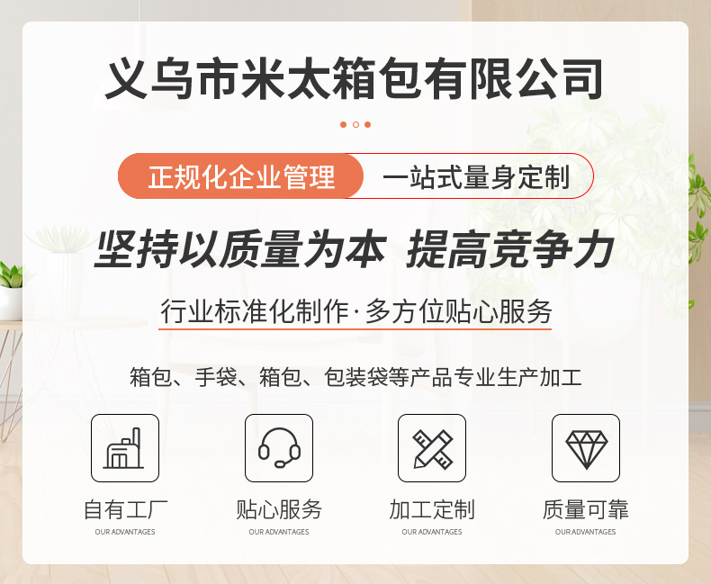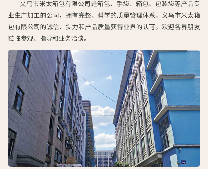 义乌市米太箱包有限公司是箱包、手袋、箱包、包装袋等产品专业生产加工的公司,拥有完整、科学的质量管理体系。义乌市米太箱包有限公司的诚信、实力和产品质量获得业界的认可。欢迎各界朋友莅临参观、指导和业务洽谈。