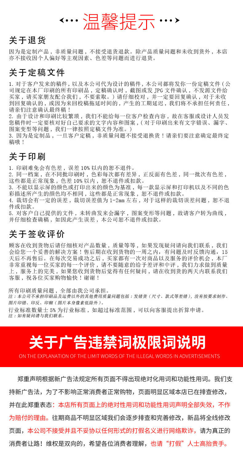 【温馨提示】:此页面中所示宝贝价格并无实际意义,请不要擅自拍下,本店都是定制产品,每个客户所做的产品不一样,为了节省亲们的时间, 亲们在询价前先了解好要定做的标签规格、数量、形状、颜色等因素一次向店主提出询价。未经咨询擅自下单商家将随机发送样品。