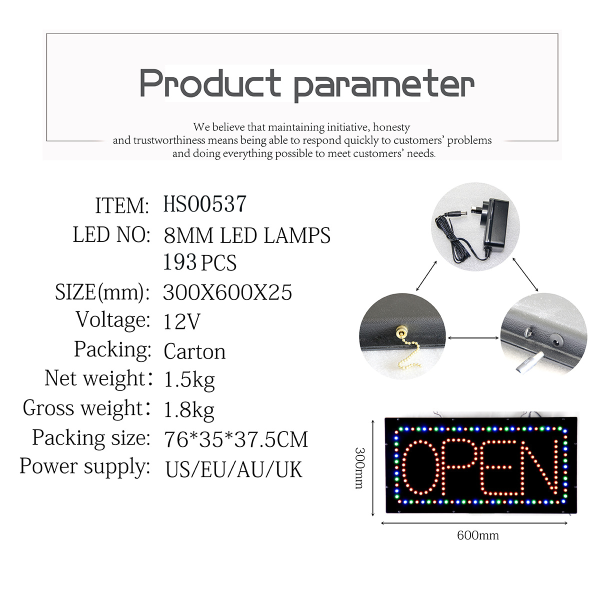 LED open sign电子 招牌是本公司采用新型LED(发光二极管)灯珠、开关电源和压克力等材料精心制作,并结合CPU中央编程控制器而开发的一种实用型发光字招牌。
