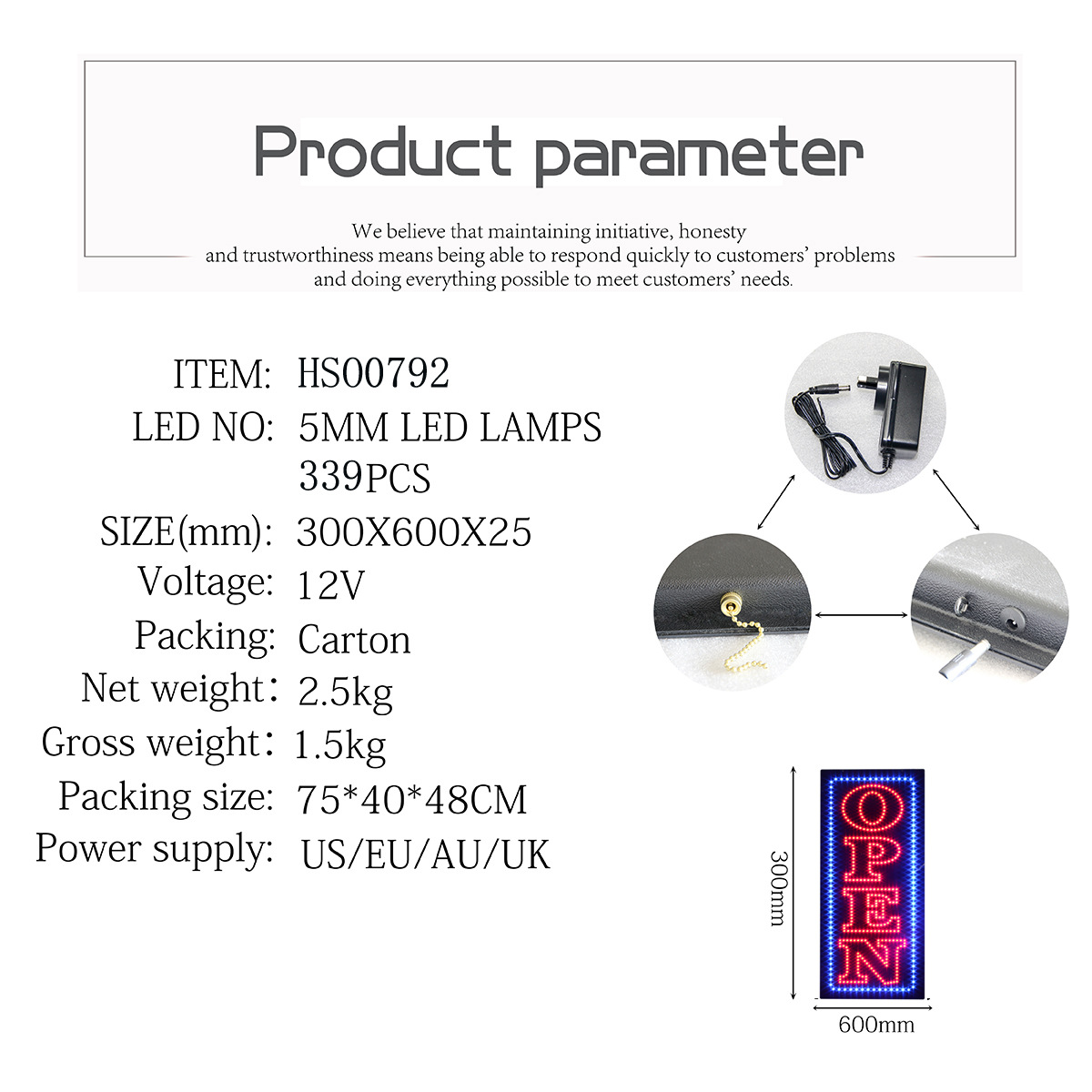 LED open sign电子 招牌是本公司采用新型LED(发光二极管)灯珠、开关电源和压克力等材料精心制作,并结合CPU中央编程控制器而开发的一种实用型发光字招牌。