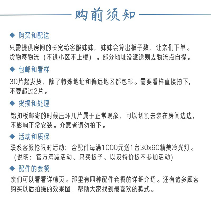 3.辅材龙骨边角等长度为3米,电梯较小上楼不便的可提前说明发货时会裁短一点。
