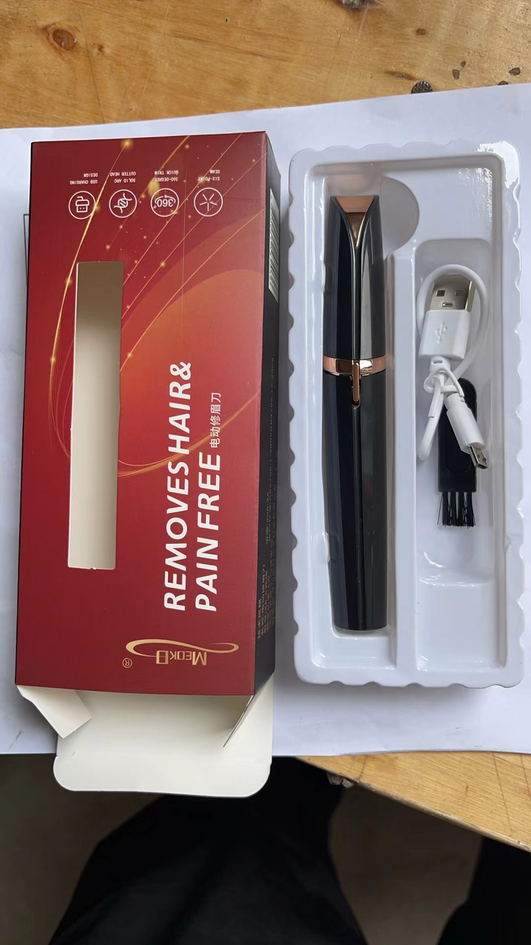产品清单: 电动修眉刀整机+充电数据线+毛刷+彩盒