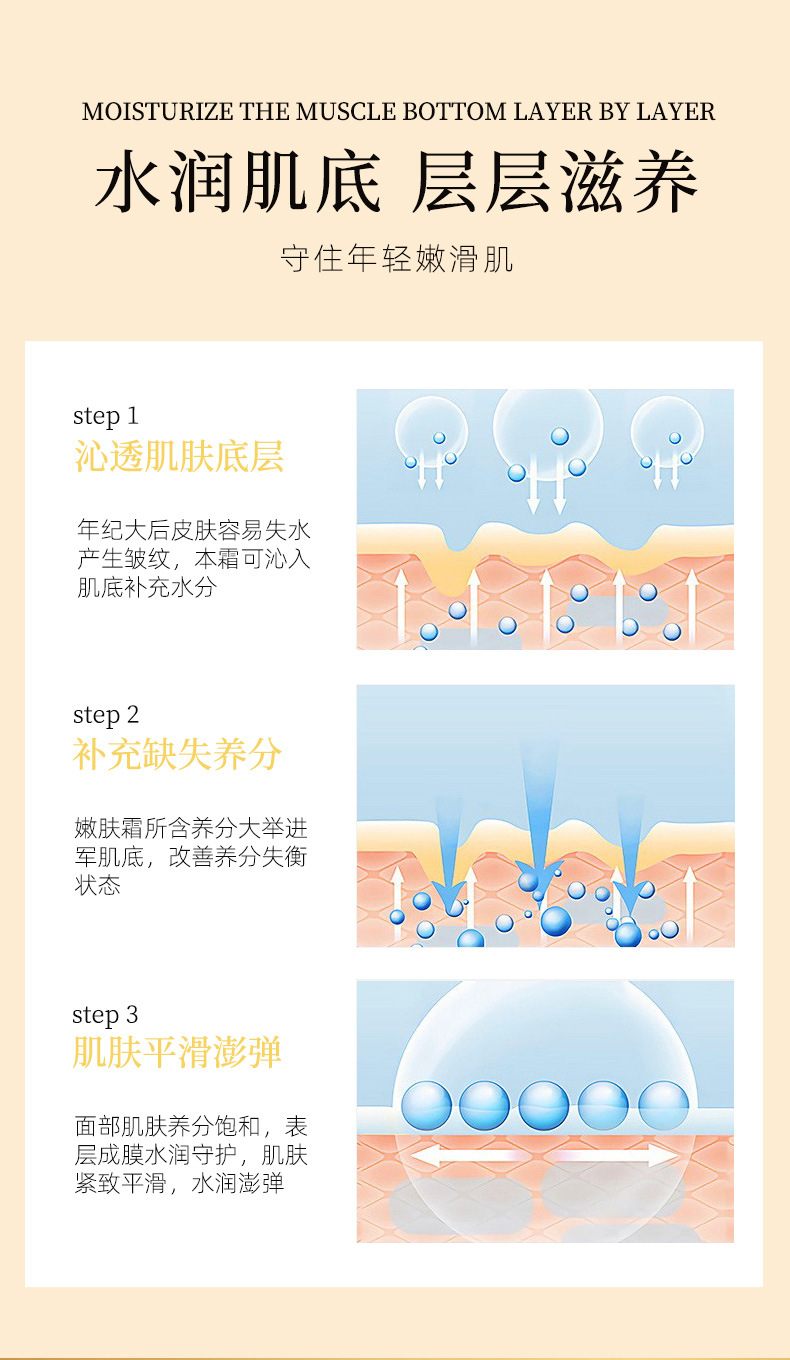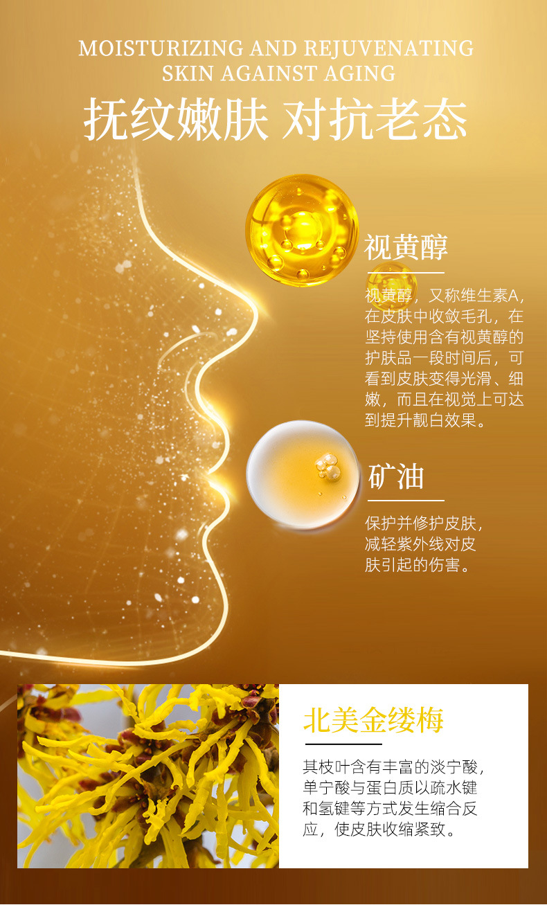 【功效】质地轻薄水润,润而不油,轻轻一抹,滋润嫩肤,补充肌肤水分,保湿盈润,帮助改善干燥缺水的状态,水嫩抗皱,使肌肤嘭弹柔嫩,细腻丝滑。